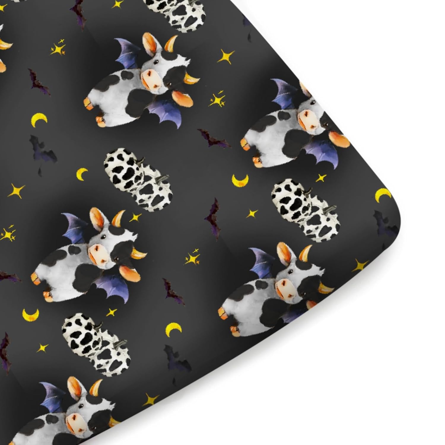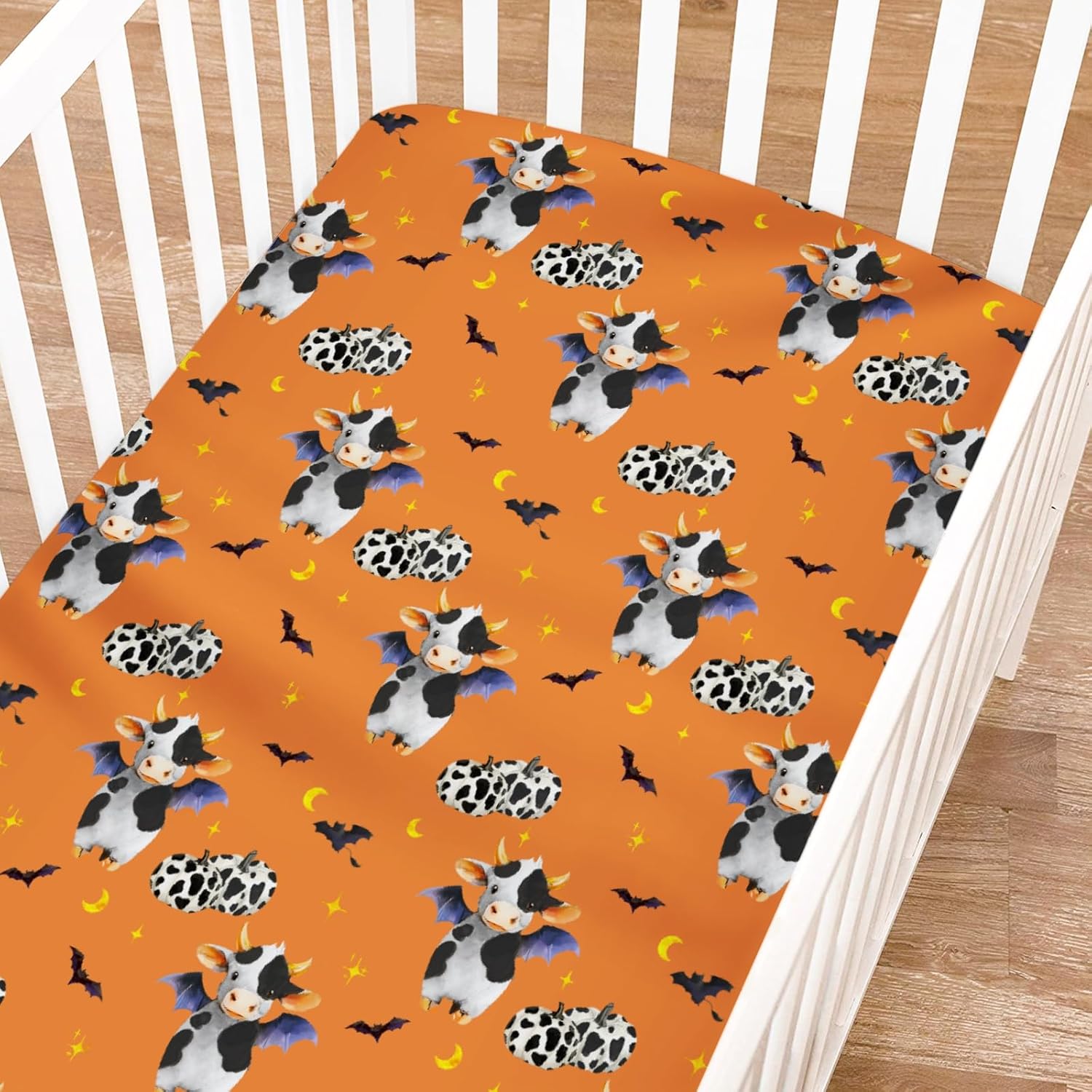 The unique designed Halloween farm animals themed baby crib sheets add a cozy and comfortable look for your little baby's room. Mix the fun of matching, printed patterns and vibrant colors to create a cozy sleeping area. The baby sheet crib fits perfectly on most standard crib mattresses and toddler mattresses, measuring 52" x 28" x 9". Featuring an elastic band, easy to put on and take off. 360-degree coverage for your luxury mattress. Match any nursery style and cribs of your dreams. Whether you're expecting a boy or girl, newborn or toddler, these unisex bed sheets for baby will never go wrong. We offer various nursery bedding accessories: baby blanket, bassinet sheets, portable crib sheets, changing pad covers, nursery area rugs, nursery tapestry, nursery pillow covers and nursing covers.