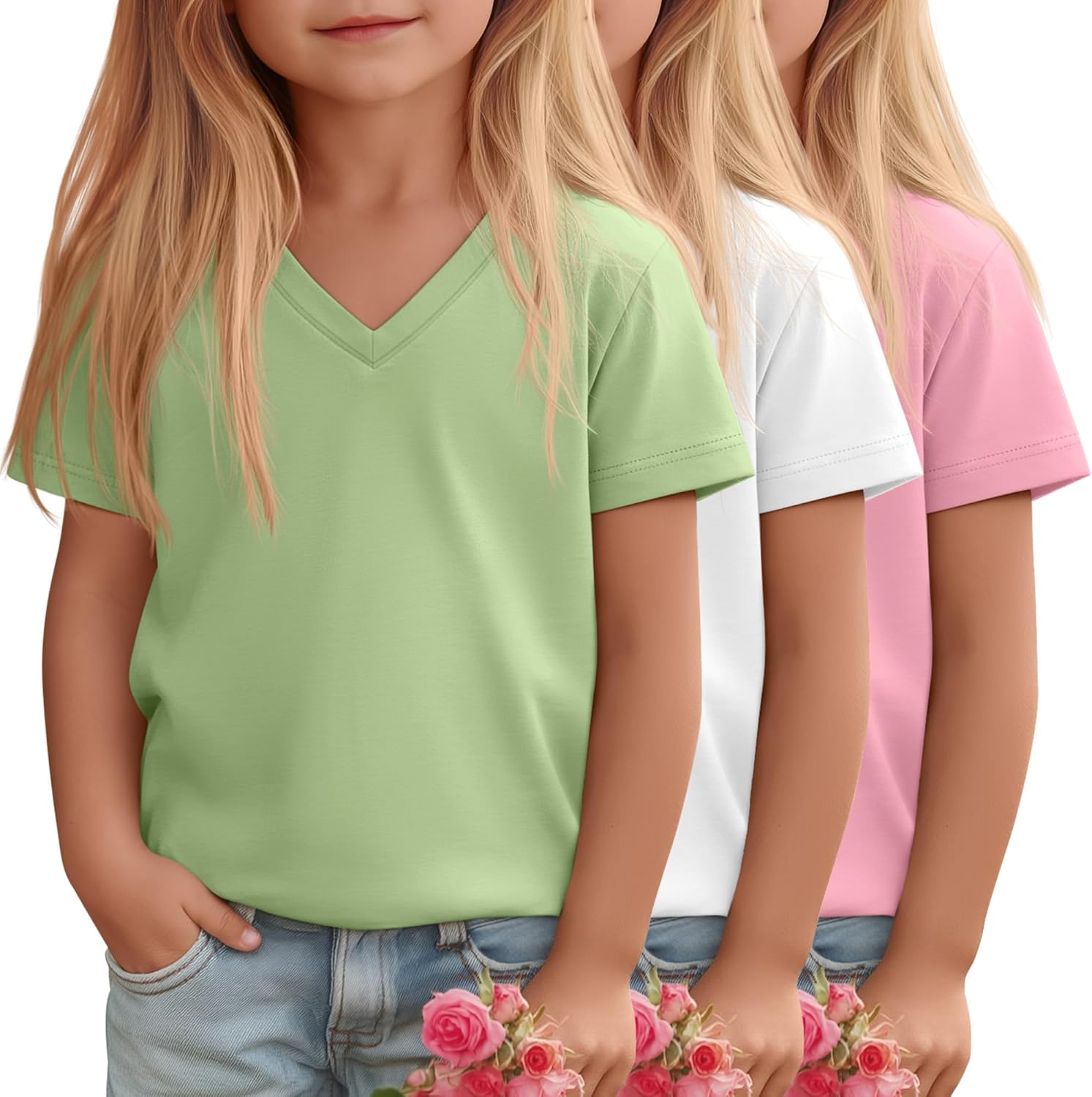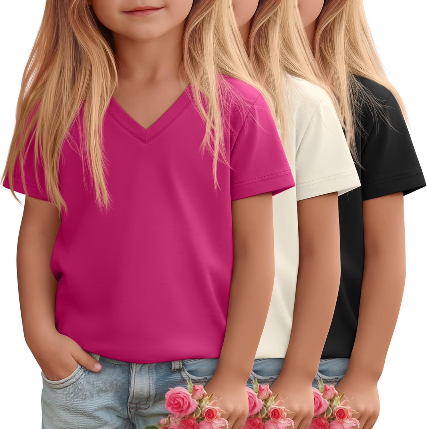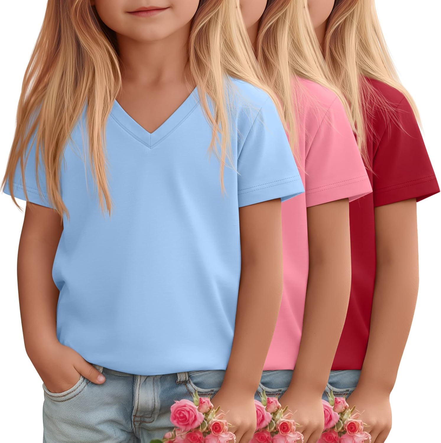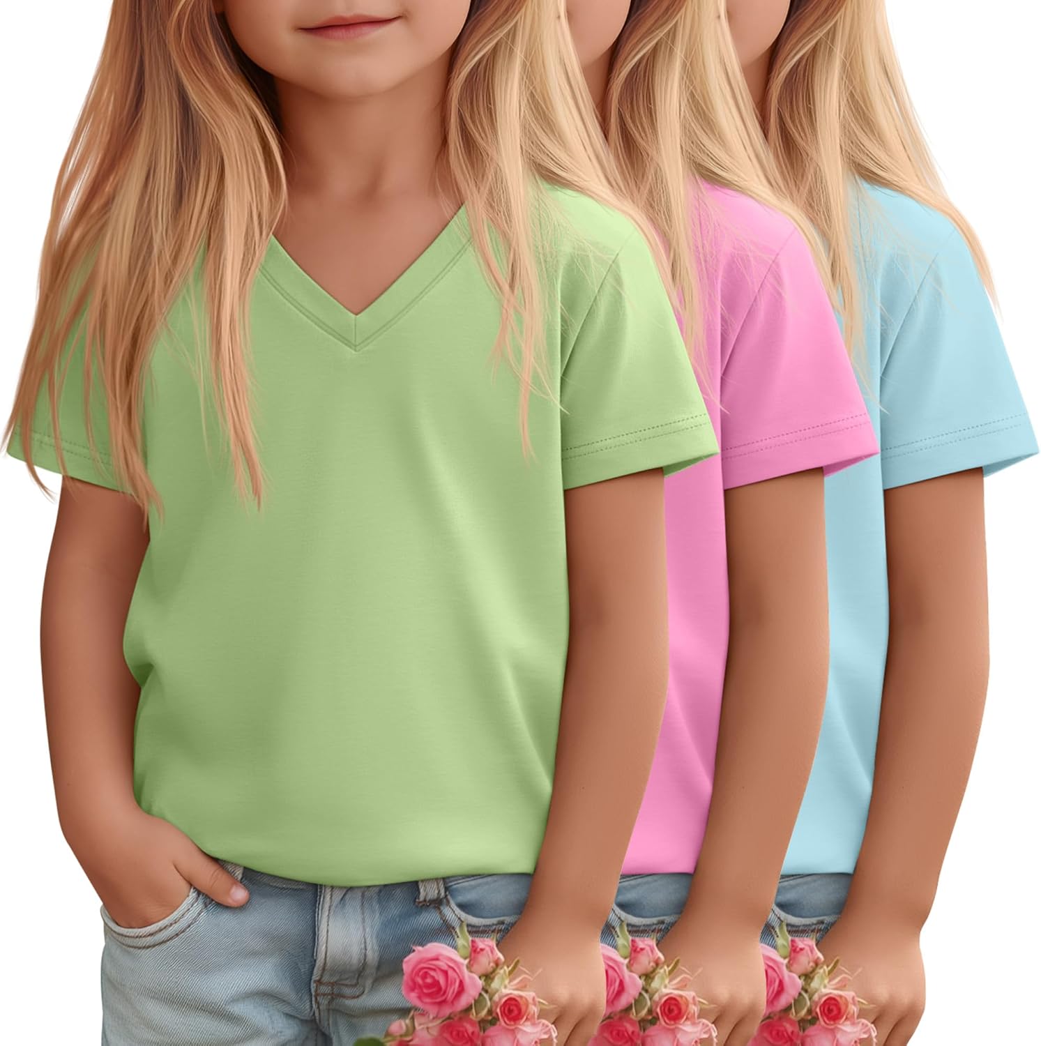 Design: Dress your little girl in this stylish and comfortable V-neck T-shirt, ideal for daily wear! Designed for toddlers aged 18 months to 5 years, this shirt offers a relaxed fit that ensures plenty of freedom for play and movement. Whether they're heading to school, a play date, or a daily casual, this T-shirt is a basic item in their wardrobe The toddler tees combine comfort, style, and practicality. Suitable for various occasions, it's easy to match and create a fresh and cute look Care Tips: The kid's t-shirt is machine washable or hand washable and will maintain its shape even after multiple washes, without easily deforming or fading >Material: 60% Polyester, 35% Cotton, 5% Spandex Quantity: 3 Pcs Season: Spring, Summer Remarks: Manual measurement, please allow slight errors in size Colors may vary slightly due to different screen displays