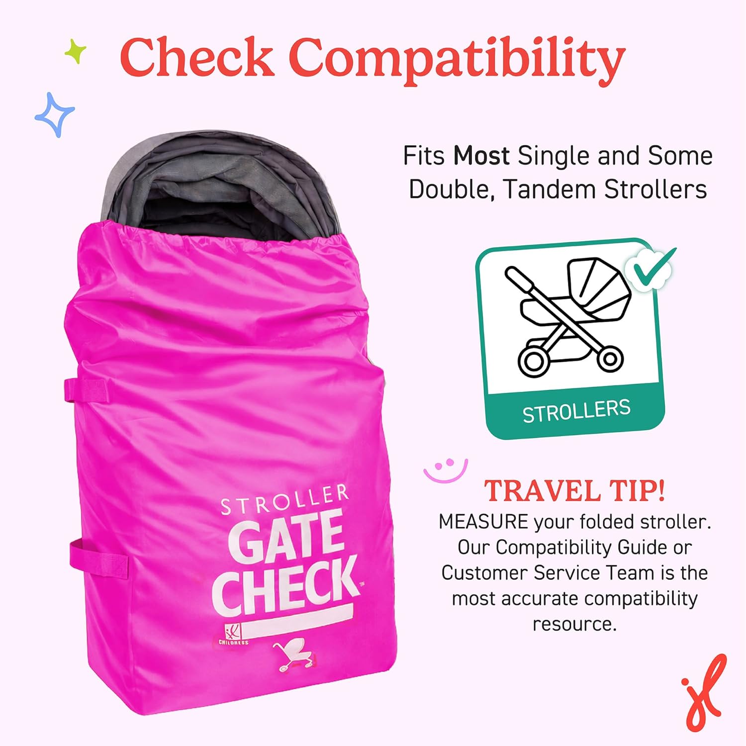 Stroll down the airport concourse with confidence knowing your stroller will be protected! The J.L. Childress Gate Check Bag for Single & Double Strollers has been a go-to travel bag for parents for almost 20 years. This durable yet lightweight bag fits and easily covers most standard single strollers and some double, tandem strollers. Be sure to measure your stroller or check the Compability Guide on the J.L. Childress website to ensure a good fit. NEW FEATURE: The interior of the bag features a silicone Apple AirTag holder so you can track the location of your bag during travel (AirTag not included). A drawstring closure with adjustable lock, reinforced seams and dual carry handles are designed to make traveling a bit easier and provide you with peace of mind knowing your stroller is well protected. The attached stretch pouch makes unfolding and refolding the bag quick and easy. The large white ID box for your name helps to quickly identify your stroller. The durable fabric and large GATE CHECK logo help ensure that your stroller is protected and safely returned to you at the end of your flight. It’s also the perfect bag to use for storage when your stroller isn’t in use. You pack the snacks, we’ve got the stroller covered. AIRLINE APPROVED and recommended by baggage handlers around the world. Trust J.L. Childress, the original inventor of the stroller and car seat Gate Check Bags. Around the world or around the block, Travel Happy with J.L. Childress!