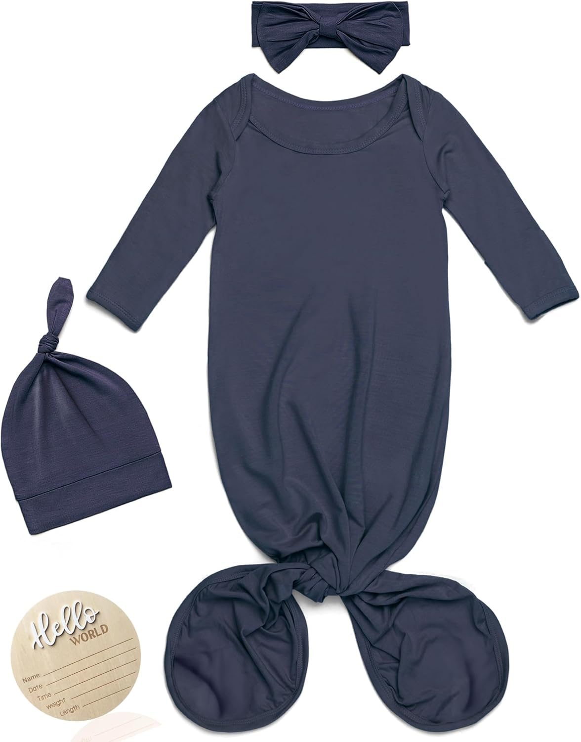 Newborn Baby Knotted Gown Hat Set – Soft Modal Cotton Infant Sleeper with Mittens Material: 95% Modal Cotton, 5% Spandex – Soft, Stretchy, and Comfortable. 3 Decorative Buttons Fold-over Mittens Easy Leg Opening at the Bottom These knotted gowns make the perfect bring-home outfit, keeping your baby warm and snug. Changing diapers is a breeze with the simple knotting at the bottom, ensuring their tiny legs are covered and cozy.