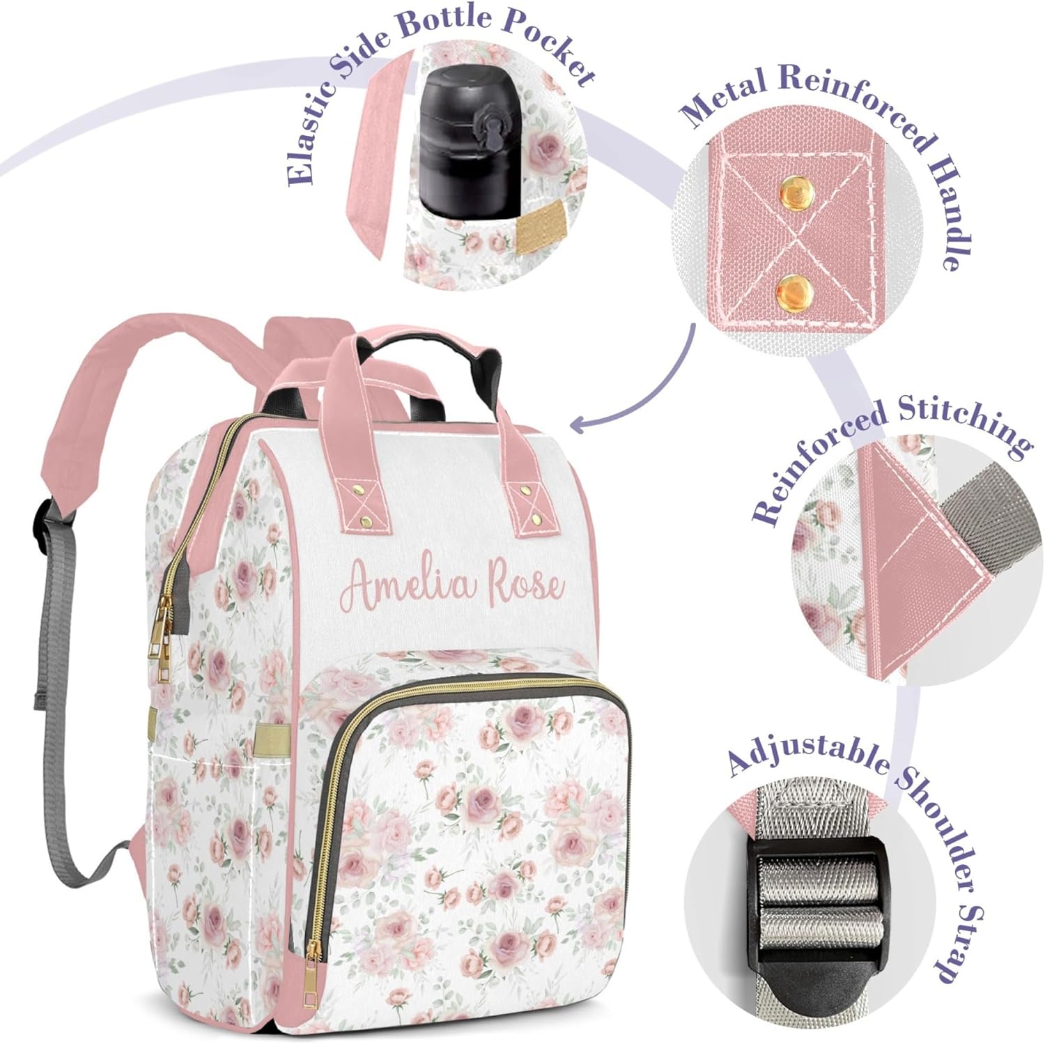 Spacious Multi-Compartment Diaper Bag: Our custom diaper bag backpack features a large main compartment with multiple pockets and dividers, 3 zipper compartments, and 11 small pockets for ample storage capacity. It provides plenty of space for diapers, wipes, bottles, clothes, and other baby essentials. Available in 2 sizes: Medium: 8.6" (L) x 6.2" (W) x 15.7" (H), Large: 10.6" (L) x 6.7" (W) x 17.3" (H). Insulated & Elastic Bottle Pockets: Our custom name diaper bags for boys and girls features insulated side pockets that keep baby bottles or snacks at the ideal temperature for hours. The elastic top and optimized size securely hold standard-sized bottles to prevent tipping and leaks. Additional stretchy side pockets offer convenient storage for umbrellas, water bottles, and more.Practical & Water-Resistant Fabric: The personalized baby diaper bag is crafted from waterproof nylon and Oxford cloth, offering exceptional durability and waterproof protection. Designed to withstand daily wear and tear, it wipes clean easily for low-maintenance care. The reliable material keeps your belongings safe and dry, making it an ideal baby bag for travel, outdoor adventures, trips, and picnics.Comfortable & Adjustable Straps: This personalized diaper backpack features adjustable padded shoulder straps and a breathable back panel for parents'maximum comfort. The sturdy top carry handle is metal-reinforced for extra durability. It also includes stroller straps for versatile carrying options. Smooth dual-zipper design allows easy opening, closing, and access to your essentials.Stylish & Customizable Design: Say goodbye to boring diaper bags! This fashionable and customizable baby fashion diaper bag makes the perfect gift for new moms, dads, or baby showers. We offer customized backpacks for boys and girls in a variety of designs that blend functionality with modern aesthetics.