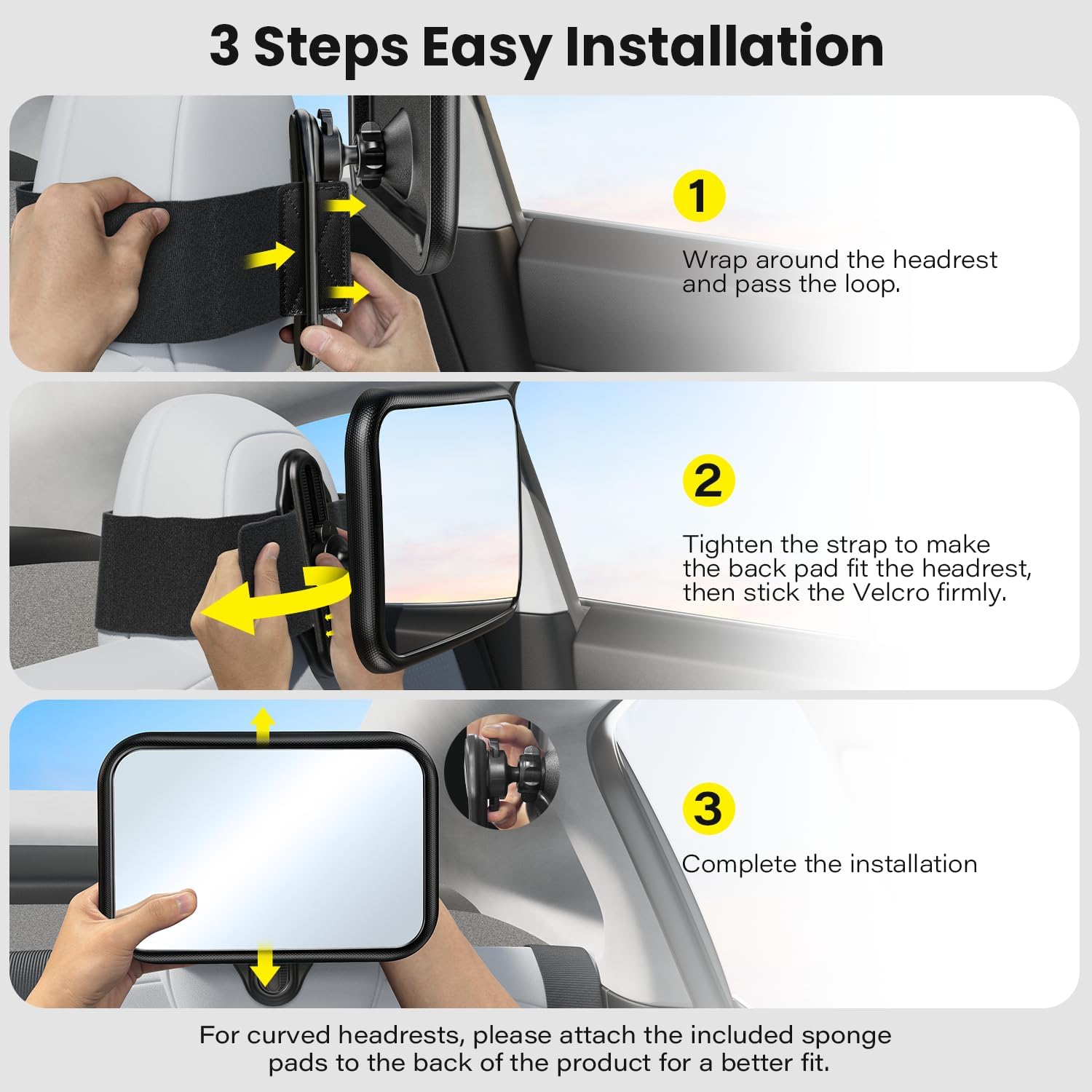 | Other Special Features of the Product | Specially for Fixed Headrest | Compatible with Tesla | Extra-Wide Velcro Strap | Unique Sliding Ball Joint | Shatterproof Acrylic Mirror | Anti-Slip Silicone Backing | No-Wobble Locking Nut | Dual Installation Modes | Tool-Free Installation | Wide Angle Convex Lens | Parent Peace of Mind | Shatterproof |