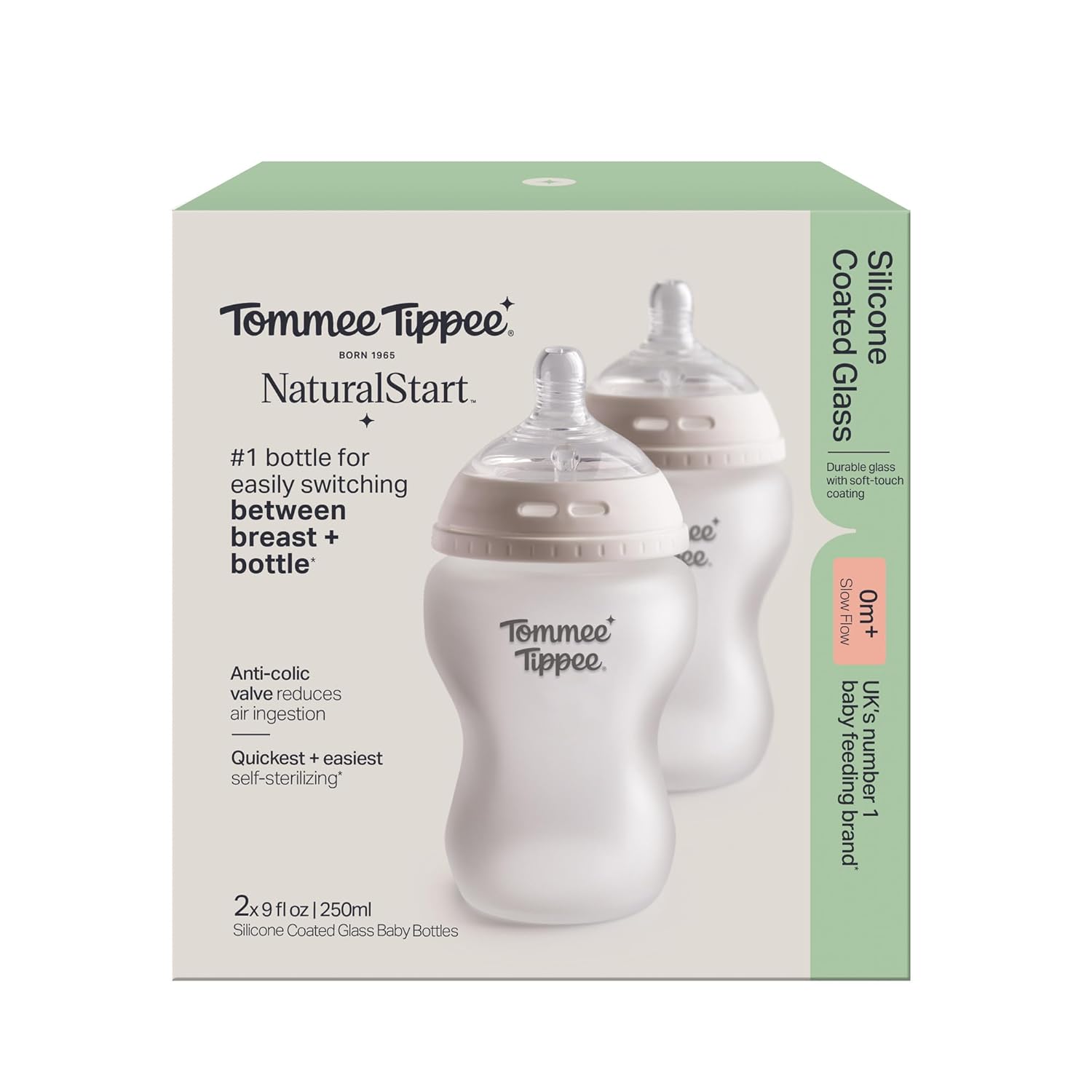 Our shatter-proof glass bottle with premium, soft-touch silicone finish offers added safety for baby and extra comfort for you. Made to last, the bottle's baby-safe borosilicate glass is scratch and stain resistant and doesn't release any harmful substances. Plus, its innovative easy-grip silicone coating helps prevent drops and breaks, while also being velvety smooth to hold. The glass wont absorb smells or flavors from the milk The glass won't shatter if it breaks when dropped Designed to help reduce nipple confusion, and make switching from breast to bottle and back again, easy 95% of babies accept a Tommee Tippee bottle* Built-in anti-colic valve thats proven to reduce air intake Self-sterilizing in 3 minutes in the microwave BPA, BPS and Phthalate free Dishwasher safe*To verify, please visit the Amazon product page