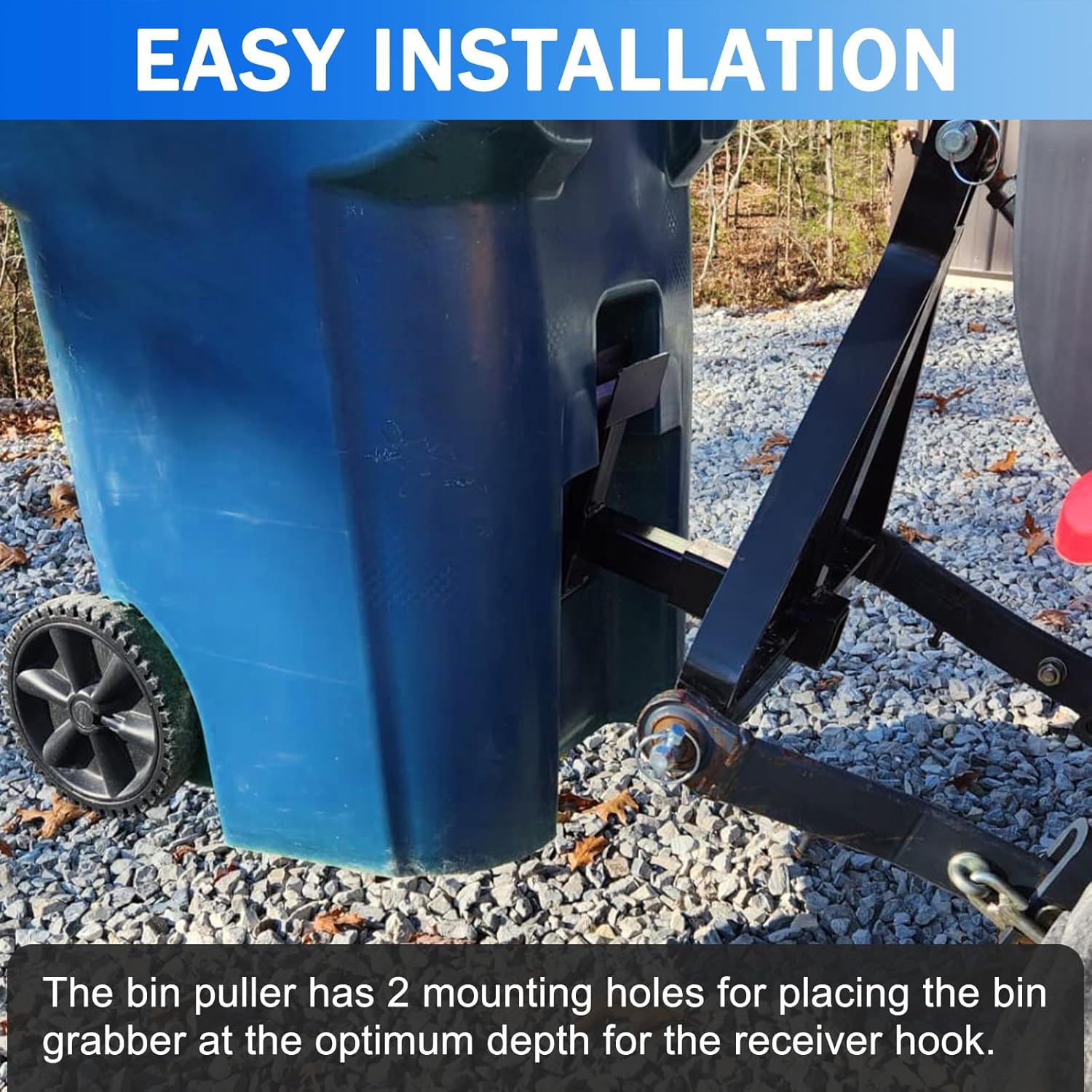 Applicability - Designed for use with standard 2‘ receiver hitches, the bin puller is ideal for cars, trucks, golf carts, and lawn tractors, and can be used with all 2’ automotive style receivers Heavy Duty - Garbage Hauling Towing Hitch is made of high quality steel with black powder coating, rustproof and durable Wide Application - Attach the grapple hook receiver to the bucket with the bucket hook clip to bring your large bin to the end of a long, steep driveway on trash day. Easy to navigate through grass, gravel, uneven roads, even mud and snow! Easy Installation - Simply lift it on the trash can carrier, you will never have to manually move these bulky bins again, or worry about them falling or tipping over Recommendation - The Trash Can Hauler Grabber is recommended for use with the 2’ receiver on the 3-point hauling rack. This setup will provide proper clearance for your bins!
