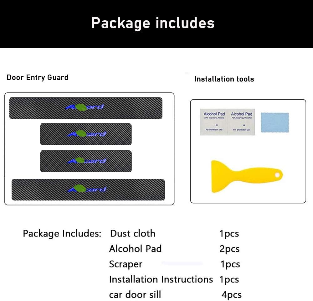Feature: - Material: Carbon Fiber Leather - Made of high quality material, the sticker is durable and long lasting use. - Perfect for car door sill plate decoration - Can effectively protect the edge of the outside door sill plate , absorbs impacts and prevents scratches. - Can cover existing scratches, make your car more beautiful. - lnstallation is very easy, it have glue on the back - Decorative and protective your car door sill scuff plate Fit : For Honda Accord 2012-2025 -Size: Front door: 21.6 X 2.75 Inch; Rear door:15.7 X 2.75 Inch Please confirm that the size is suitable for your car or not. Installation Tips: 1.Ensure that the surface which the product is to be applied is clean, dry and free of all dust, grease and wax. 2.Determine exact location of product 3.Remove protective film from adhesive, align carefully and then press firmly to insure proper adhesion 4.Do not move the product or wash your car in 24 hours after installation Package List: 4 PCS Door Entry Guard.