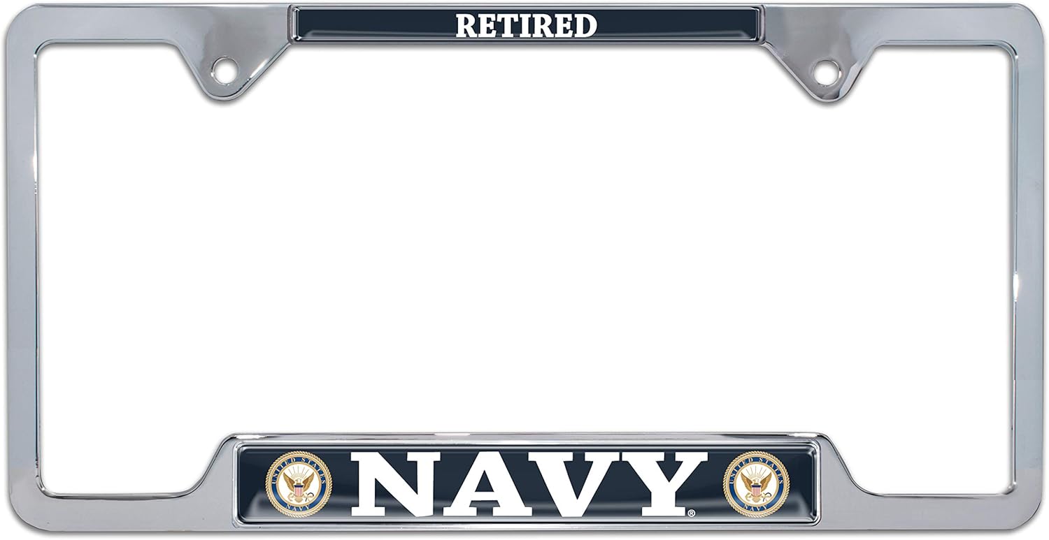 Show your American pride and patriotism with this Officially Licensed United States Navy black powder coated metal license plate frame by Elektroplate. This high-quality all-metal frame is built to endure the elements, ensuring it remains looking brand new for years without chipping or fading. The frame features Made in the USA graphic inserts with 3D doming, vivid colors, and UV protection. Gear up with this U.S. Navy premium product, built for those who demand strength, durability, and unwavering commitment in every mission. This open corner, non-blocking tag holder frame legally displays license plate registration tags and stickers for all 50 states. Designed to fit 12" x 6" standard license plates.