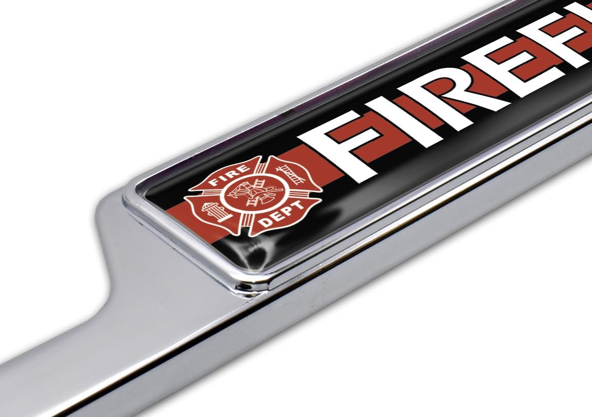 Support our first responders and heroes everywhere you drive with this Firefighter "First In, Last Out" chrome-plated metal license plate frame by Elektroplate. This high-quality all-metal frame is built to endure the elements, ensuring it remains looking brand new for years without chipping or fading. The frame features Made in the USA graphic inserts with 3D doming, vivid colors, and UV protection. Our high-end license plate frames are the perfect way to elevate your vehicle’s style. This open corner, non-blocking tag holder frame legally showcases license plate registration tags and stickers for all 50 states. Designed to fit 12" x 6" standard license plates.