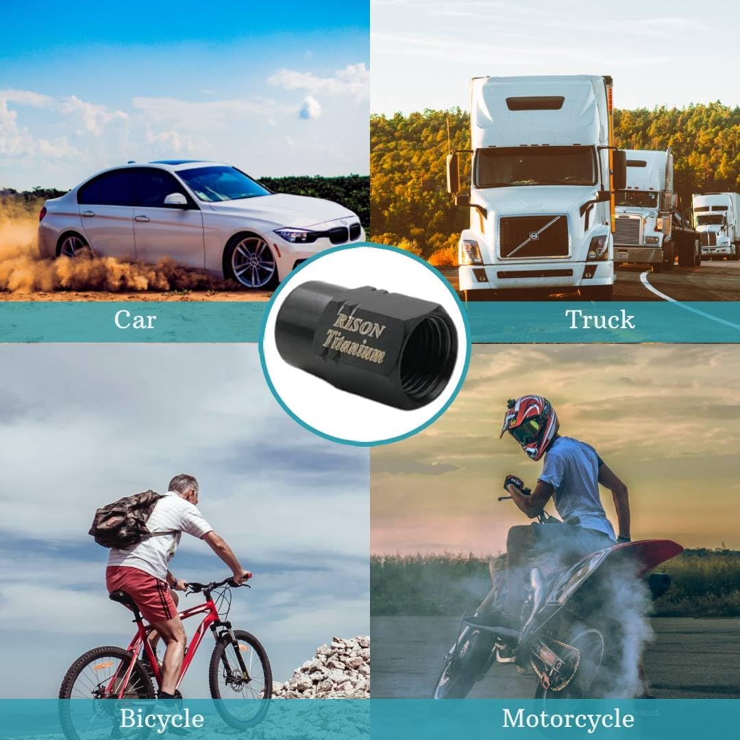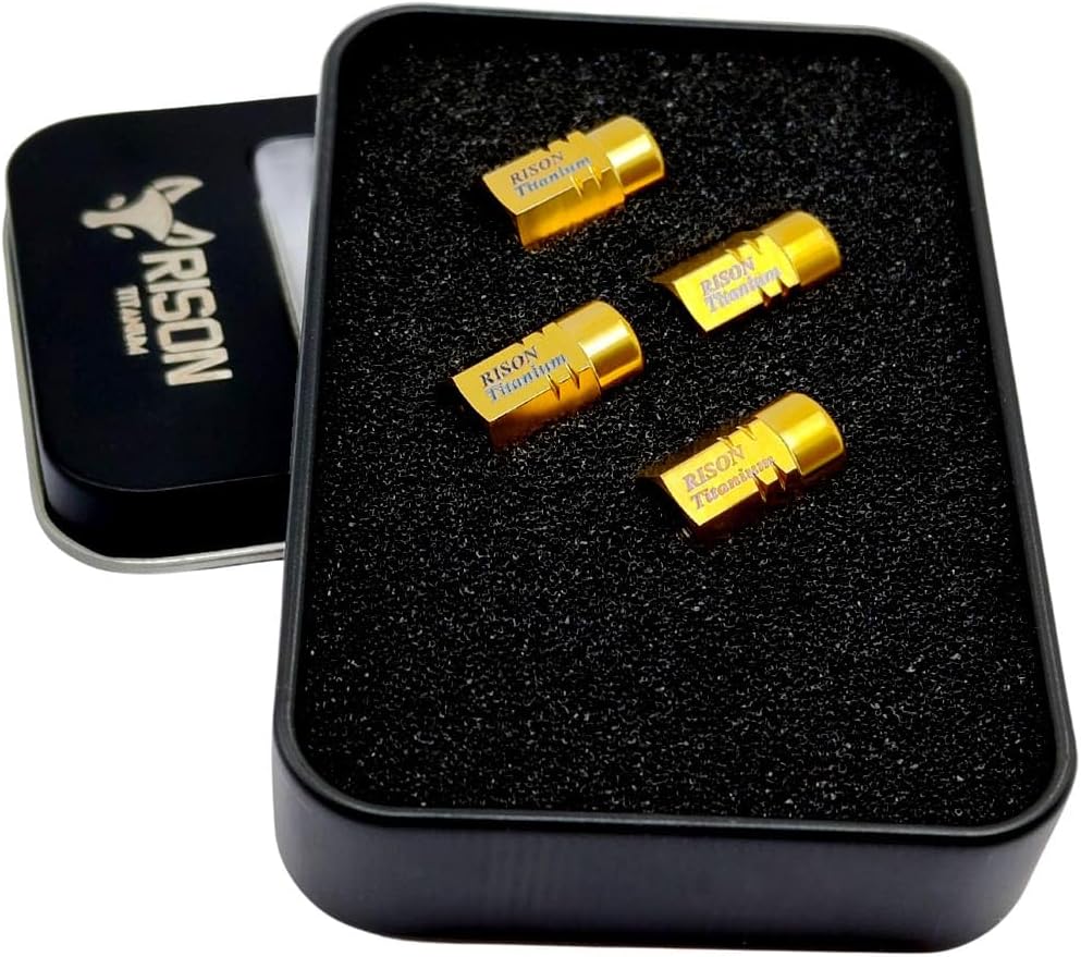 RISON-Titanium has been focusing on titanium products for ten years.RISON Titanium Car Tire Valve Caps 4Pcs Tyre Valve Stem Cover Dustproof Tire Cap Air Dust Wheel Rim Cap Type AA Anti-Rust Hexagon Design Screw-On Tire Stem Valve CapsSpecifications:Tire stem measurement: The tire stem diameter is approx 8.9 mm, and they are 16 mm highMaterial: TitaniumColor: Gold/Black/Rainbow/Burnt Blue/Blue Purple/Green/Candy/Purple/Original Package includes:4 Pcs x Tire valve capsUniversal Tire Stem Valve Caps:These dust covers for wheels help keep tires inflated at the proper level on car, SUV, trucks, and other motor vehicles.Premium Material: This is a rare metal with a glossy transition. The density of titanium is about 60% of that of stainless steel. More elastic than aluminum, harder than steel, stable and no rust! Titanium stem tire valve caps can protect your valves from corrosion, and prevent water, dust, or sand into the tire; enhanced seal to help prevent air leakage. ensures the safe driving.Easy Installation: Titanium Tire Valve Caps With hexagon shape design, easier to grab and tighten, Conveniently install or remove when you want to check air pressure. The cap can replace the tire's original bad valve cap. Beautiful appearance fits vehicles of various colors.Wide application: This set of tire valve caps can be applied widely, you can use them on cars and motorcycles, Universal size fits more cars, bus trucks, SUVs, motorcycles Note: To avoid the ionization fusion between the valve and the car cap, please check the cap every month by removing it and reinstalling. If you have any issues or questions please feel free to contact us, we are always here to satisfy all of you.