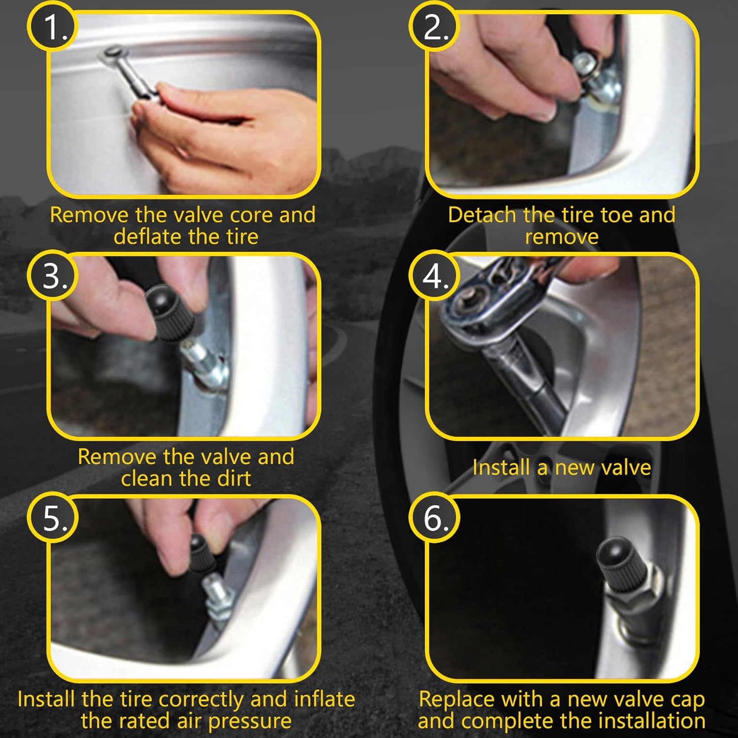| Included Components | 100 pieces of tubeless tire valve stems (TR412: 50 pcs, TR413: 25 pcs, TR414: 25 pcs) for tubeless 0.453” (11.5mm) diameter rim holes, these tire valves are 1.5" long (effetive length) and snap in easily to your tires., package contains the 100pcs rubber snap-in valve stems. |