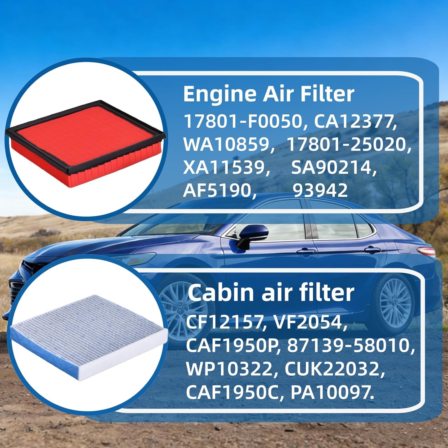 Reference Number:Engine Air Filter: 17801-F0050, CA12377, WA10859, 17801-25020, XA11539, SA90214, AF5190, 93942; Cabin air filter: CF12157, VF2054, CAF1950P, 87139-58010, WP10322, CUK22032, CAF1950C, PA10097. Compatible with:Toyota Models Camry (2018-2024) 2.5L/3.5L, RAV4 (2019-2025) 2.5L, Highlander (2020-2025) 2.4L/3.5L, Avalon (2019-2022) 3.5L; Avalon (2021) 2.5L, Grand Highlander (2024-2026) 2.4L, GR Corolla (2023-2025) 1.6L, Yaris (2021-2023) 1.6L(NOT FOR HYBRID)