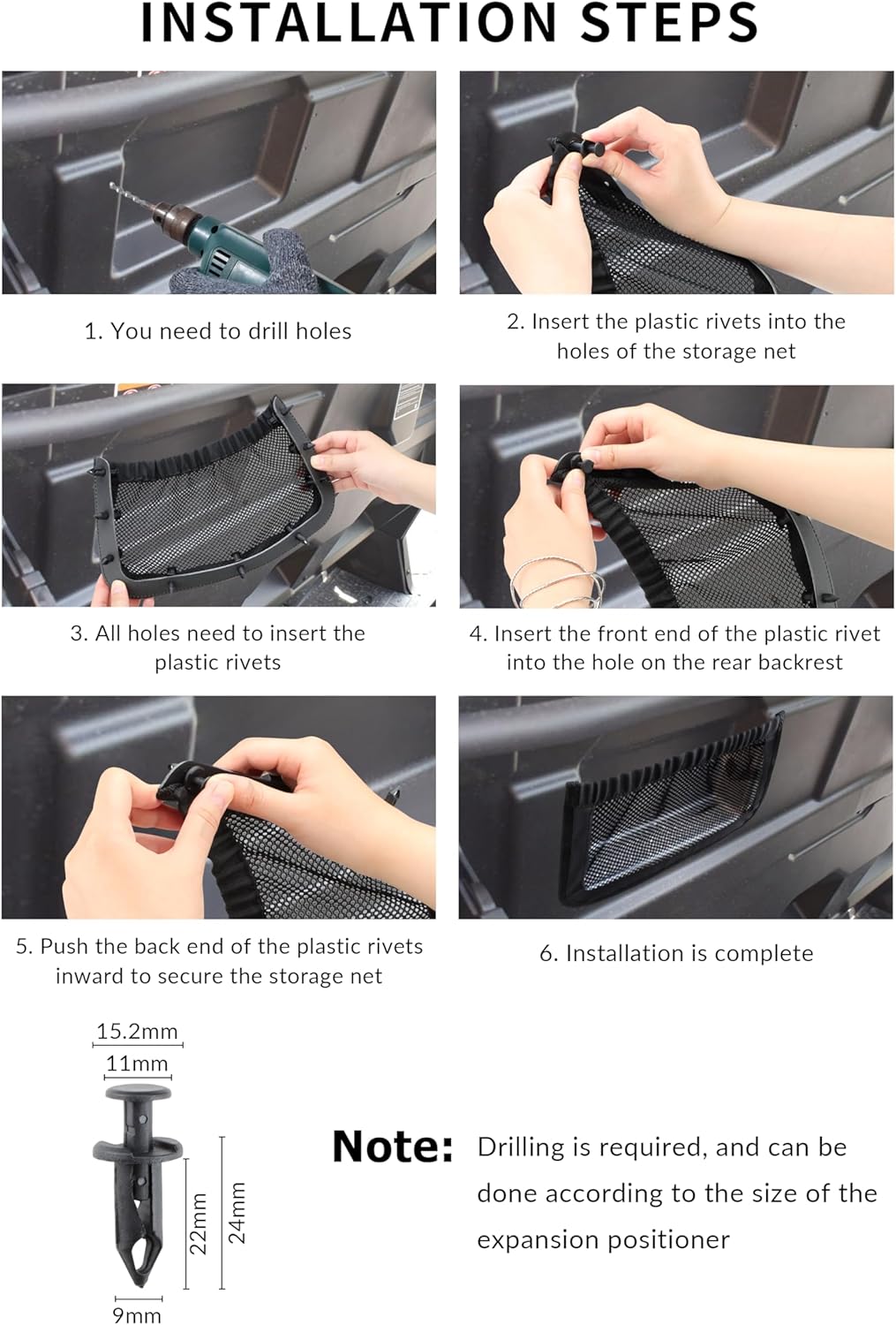 | Included Components | 2 x UTV back nets, 25 x black plastic push rivets |