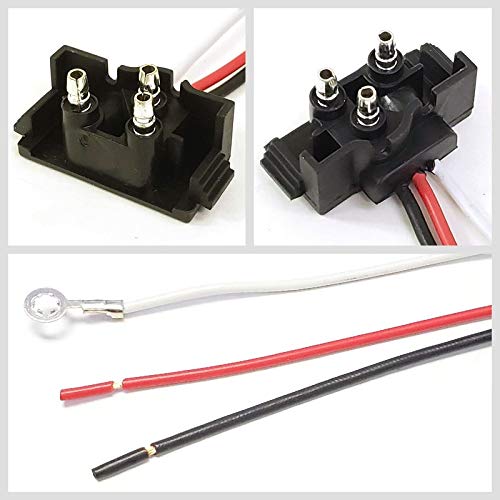 Wire Plug PigtailThree-Prongs Wire Pigtail for Sealed Trailer Stop, Turn and Tail Lights A three-prong, molded plug with a 9" lead Long for use with sealed lights, especially combination stop, turn, and tail lights. This three-wire, right angle pigtail has color coded wires coming from the plug. The red and black lead wires are bare at the ends and the white ground wire has a #10 ring terminal on the end. Features: Three prong, right angle, all-weather molded plastic plug with 9" wires Provides power connection for sealed lights, specifically combination stop, turn and tail lights Three-wire design features color coded wires Red and black lead wires are bare for making power connection ?Red is turn signal, black is tail signal White ground wire has #10 ring terminal on end Manufacturer Cross Reference Wiring plug will work as an exact replacement for: Uni Bond # PT9530 Truck Lite # 94993 Grote # 66843-3 Peterson # 421-491 Three-wire right-angle molded plug for double contact sealed lights. Ideal for use with stop, turn and tail lights. Includes #10 ring terminal on ground wire; hot wires are bare.