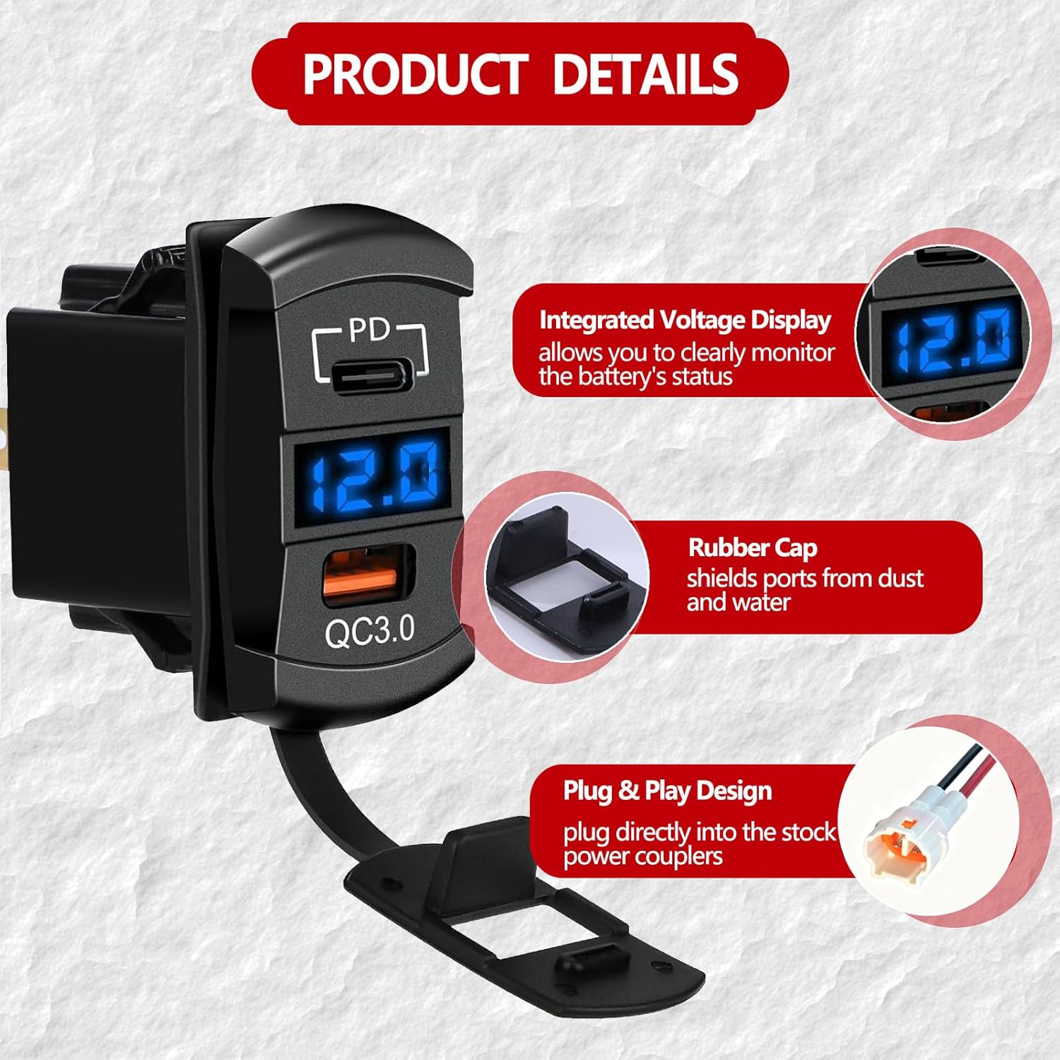| Included Components | USB Charger Rocker Switch |