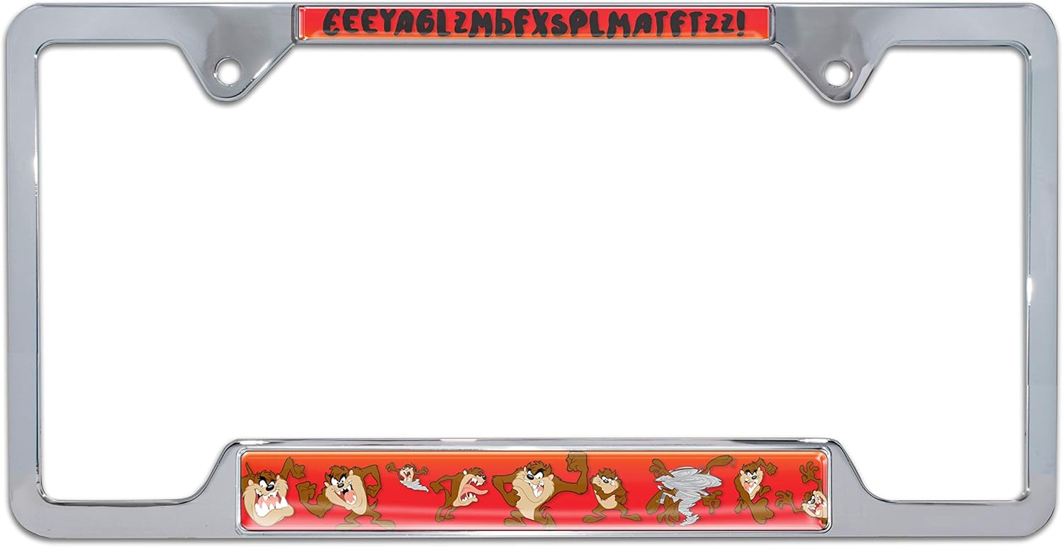 Elevate your vehicle’s style with this Officially Licensed Looney Tunes Tasmanian Devil "Taz" black powder coated metal license plate frame by Elektroplate. This high-quality all-metal frame is built to endure the elements, ensuring it remains looking brand new for years without chipping or fading. The frame features Made in the USA graphic inserts with 3D doming, vivid colors, and UV protection. Our high-end license plate frames transform your vehicle into a tribute to the classic animated series featuring a zany cast of characters. This standard size tag holder frame contains a full bottom bar of graphics and is ideal for states that require registration tags or stickers on the upper corners of the license plate, or for states that do not require tags on license plates. These states include AL, AK, AZ, AR, CA, CT, FL, HI, IL, KS, MD, MA, MI, MO, MT, NE, NV, NH, NJ, NY, OK, PA, TX, UT, VA, WA. Designed to fit 12" x 6" standard license plates.
