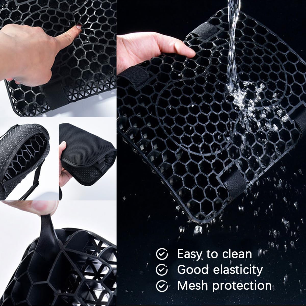 Specifications: Material: gel, mesh fabric Color: black Size: 8.27 x 11.02 inches thickness: 1.18 inches Weight: 495g/17.46oz Package Include: 1pc motorcycle seat cushion Features: -Comfortable: The 3D hollow honeycomb and breathable mesh design of this product promotes air circulation, providing a comfortable and non-stuffy riding experience. -Protective Cover: The mesh cover of this product not only protects the internal structure but also helps maintain cleanliness, making it more convenient to use.