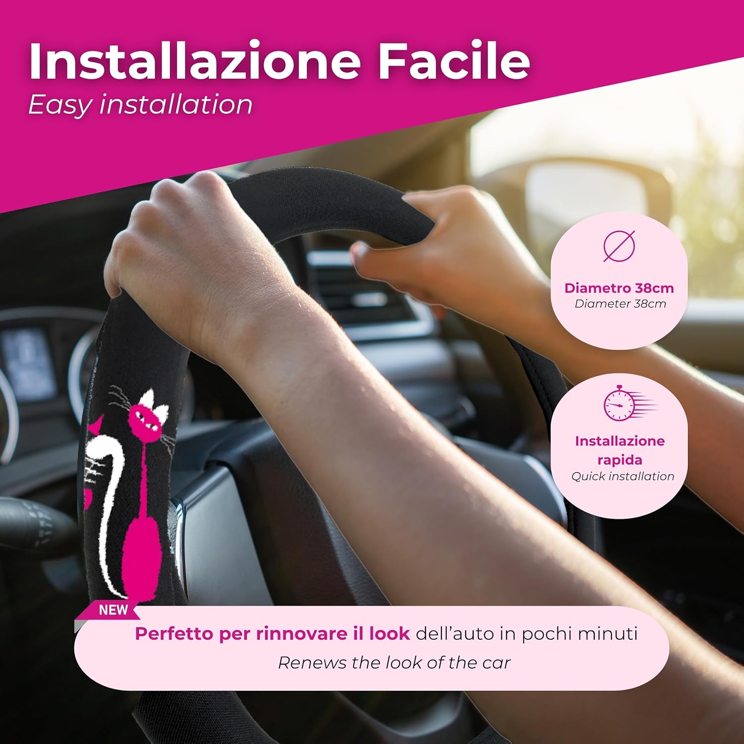 "Revolution Girl"Steering wheel cover - Black colour with pink cat