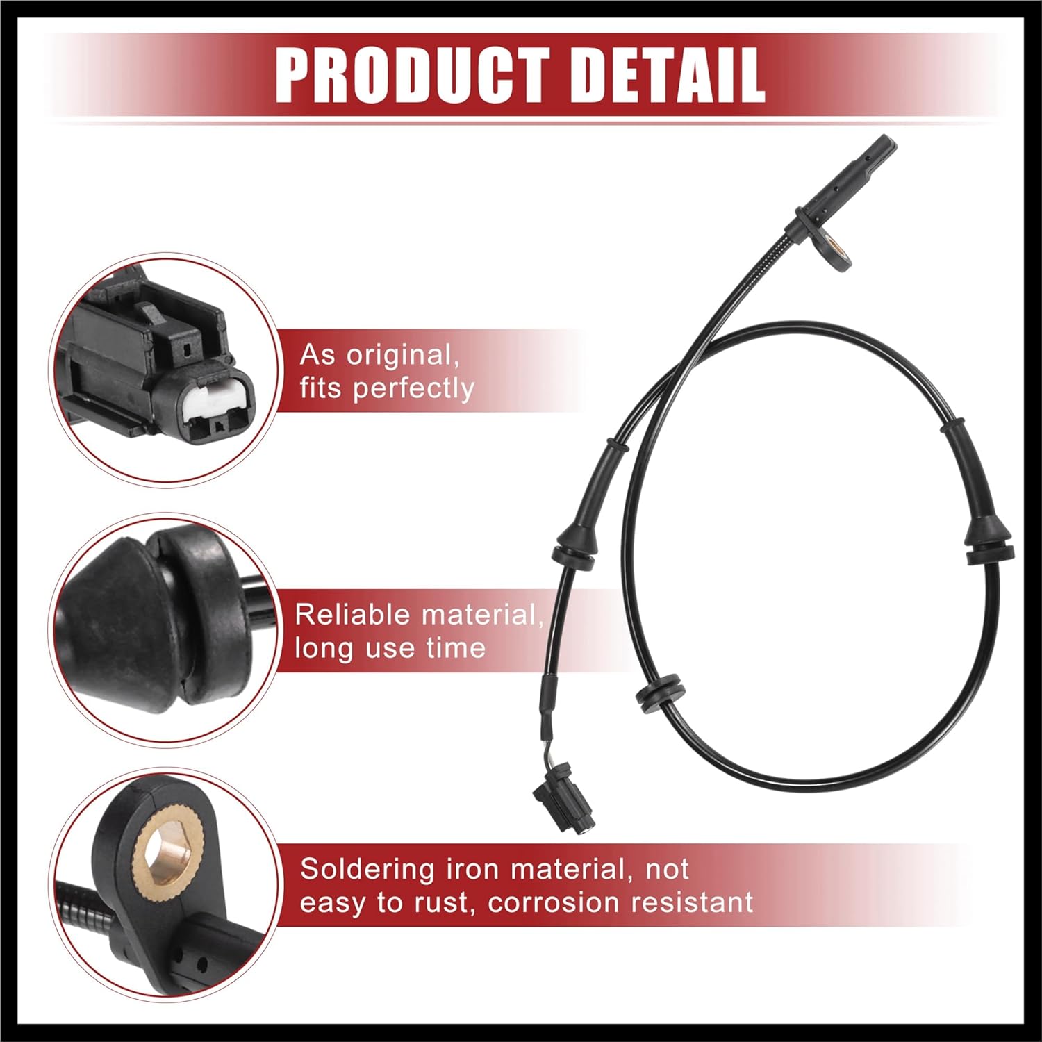 Features:Shorten the braking distance.Resolve ABS light-on or error code problems efficiently.Help improve the performance of directional stability and steering ability for the braking system.Made of solid material, durable to use.Direct replacement. Easy to install.Replace the old or worn one.Please allow 3-5mm differences due to manual measurement.This is a non-OEM product, accessory only!OE Number:47910ET000/47911ET000Specification:Color: BlackMaterial: Plastic, Rubber, MetalDimension: 79x2.9cm/ 31.10"x1.14"(L*W)Hole Dimension: 7.6x6.4mm/ 0.30"x0.25"(L*W)Fit for: for Nissan Sentra 2.0L CVT SEDAN 2009-2012for Nissan Sentra 2.0L MT SEDAN 2009-2012for Nissan Sentra 2.5L CVT SEDAN SER 2010-2012for Nissan Sentra 2.5L FULL EV-GAS (FHEV) CVT SEDAN SER 2009for Nissan Sentra 2.5L FULL EV-GAS (FHEV) MT SEDAN SPECV 2009for Nissan Sentra 2.5L MT SEDAN SPECV 2010-2012Package Includes:1 Set Car ABS Wheel Speed Sensor