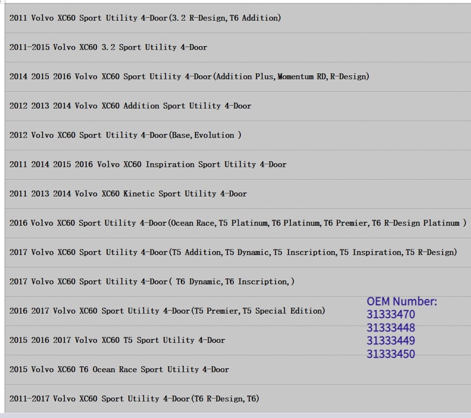 for Volvo XC60 3.2 R-Design Sport Utility 4-Door 2011for Volvo XC60 3.2 Sport Utility 4-Door 2011-2015for Volvo XC60 Addition Plus Sport Utility 4-Door 2014 2015 2016for Volvo XC60 Addition Sport Utility 4-Door 2012 2013 2014for Volvo XC60 Base Sport Utility 4-Door 2012for Volvo XC60 Evolution Sport Utility 4-Door 2012for Volvo XC60 Inspiration Sport Utility 4-Door 2011 2014 2015 2016for Volvo XC60 Kinetic Sport Utility 4-Door 2011 2013 2014for Volvo XC60 Momentum RD Sport Utility 4-Door 2014 2015 2016for Volvo XC60 Ocean Race Sport Utility 4-Door 2016for Volvo XC60 R-Design Sport Utility 4-Door 2014 2015 2016for Volvo XC60 T5 Addition Sport Utility 4-Door 2017for Volvo XC60 T5 Dynamic Sport Utility 4-Door 2017for Volvo XC60 T5 Inscription Sport Utility 4-Door 2017for Volvo XC60 T5 Inspiration Sport Utility 4-Door 2017for Volvo XC60 T5 Platinum Sport Utility 4-Door 2016for Volvo XC60 T5 Premier Sport Utility 4-Door 2016 2017for Volvo XC60 T5 R-Design Sport Utility 4-Door 2017for Volvo XC60 T5 Special Edition Sport Utility 4-Door 2016 2017for Volvo XC60 T5 Sport Utility 4-Door 2015 2016 2017for Volvo XC60 T6 Addition Sport Utility 4-Door 2011for Volvo XC60 T6 Dynamic Sport Utility 4-Door 2017for Volvo XC60 T6 Inscription Sport Utility 4-Door 2017for Volvo XC60 T6 Ocean Race Sport Utility 4-Door 2015for Volvo XC60 T6 Platinum Sport Utility 4-Door 2016for Volvo XC60 T6 Premier Sport Utility 4-Door 2016for Volvo XC60 T6 R-Design Platinum Sport Utility 4-Door 2016for Volvo XC60 T6 R-Design Sport Utility 4-Door 2011-2017for Volvo XC60 T6 Sport Utility 4-Door 2011-2017