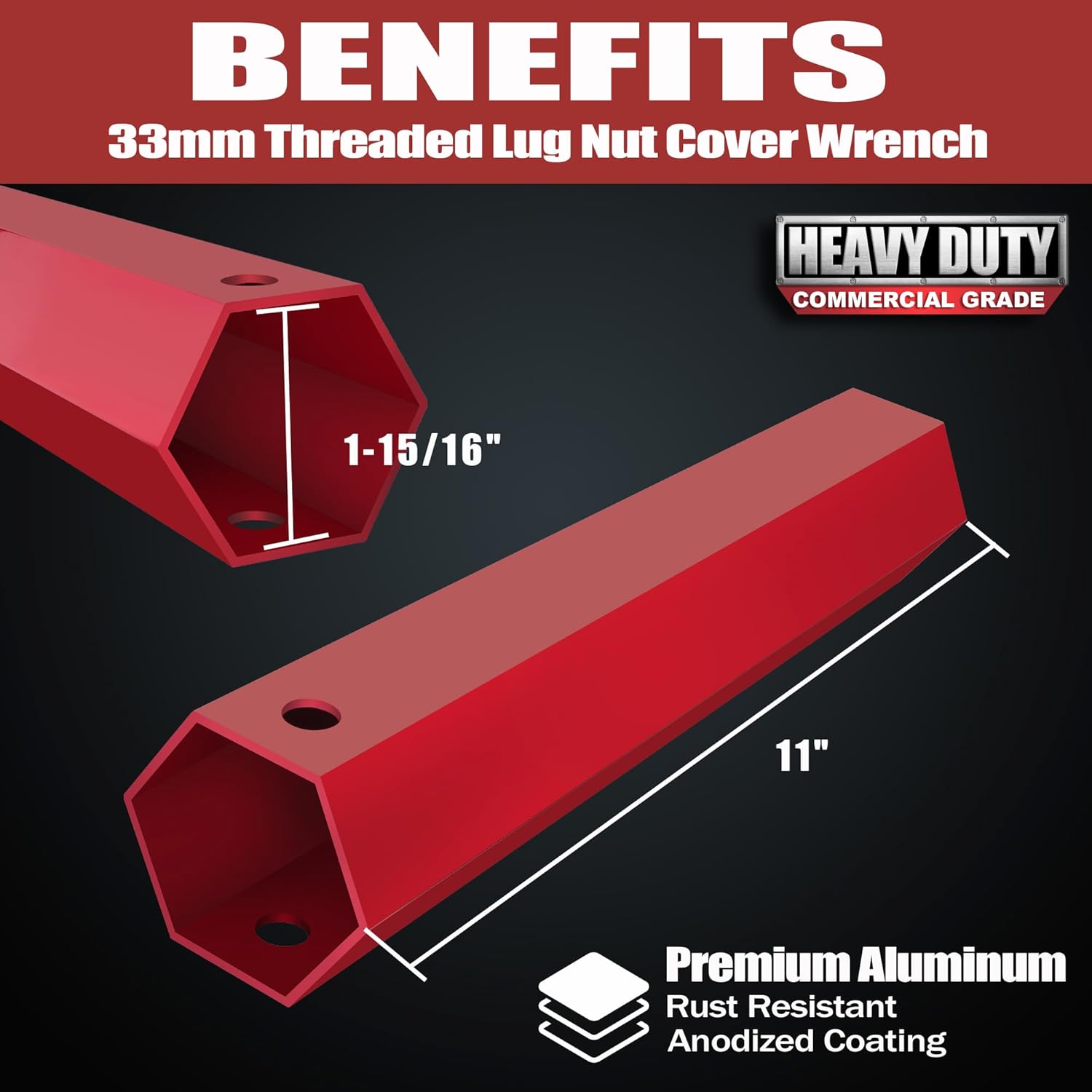 The 33mm lug nut wrench is a practical and essential tool for any vehicle owner. Designed to fit most 33mm lug nut covers, this wrench is available in red or blue. It prevents damage to the nut cover during removal or installation, ensuring a secure fit every time. With the ability to torque threaded nut covers, this wrench offers convenience and ease of use. A must-have for any car enthusiast or professional mechanic, the 33mm Lug Nut Wrench is a reliable and efficient tool that guarantees a hassle-free experience.