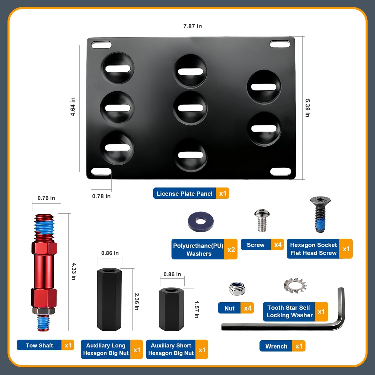 | Included Components | 1 x Black License Plate Panel, 1 x Pack Of AXECO® installation kit (Locking Screws Nuts And Wrench, synthetic rubber damper washers, etc), 1 x Red Tow Shaft fits Mini Cooper 2014-2024, 2 X Black Auxiliary hexagon big nuts (1.57 inch and 2.35 inch) |