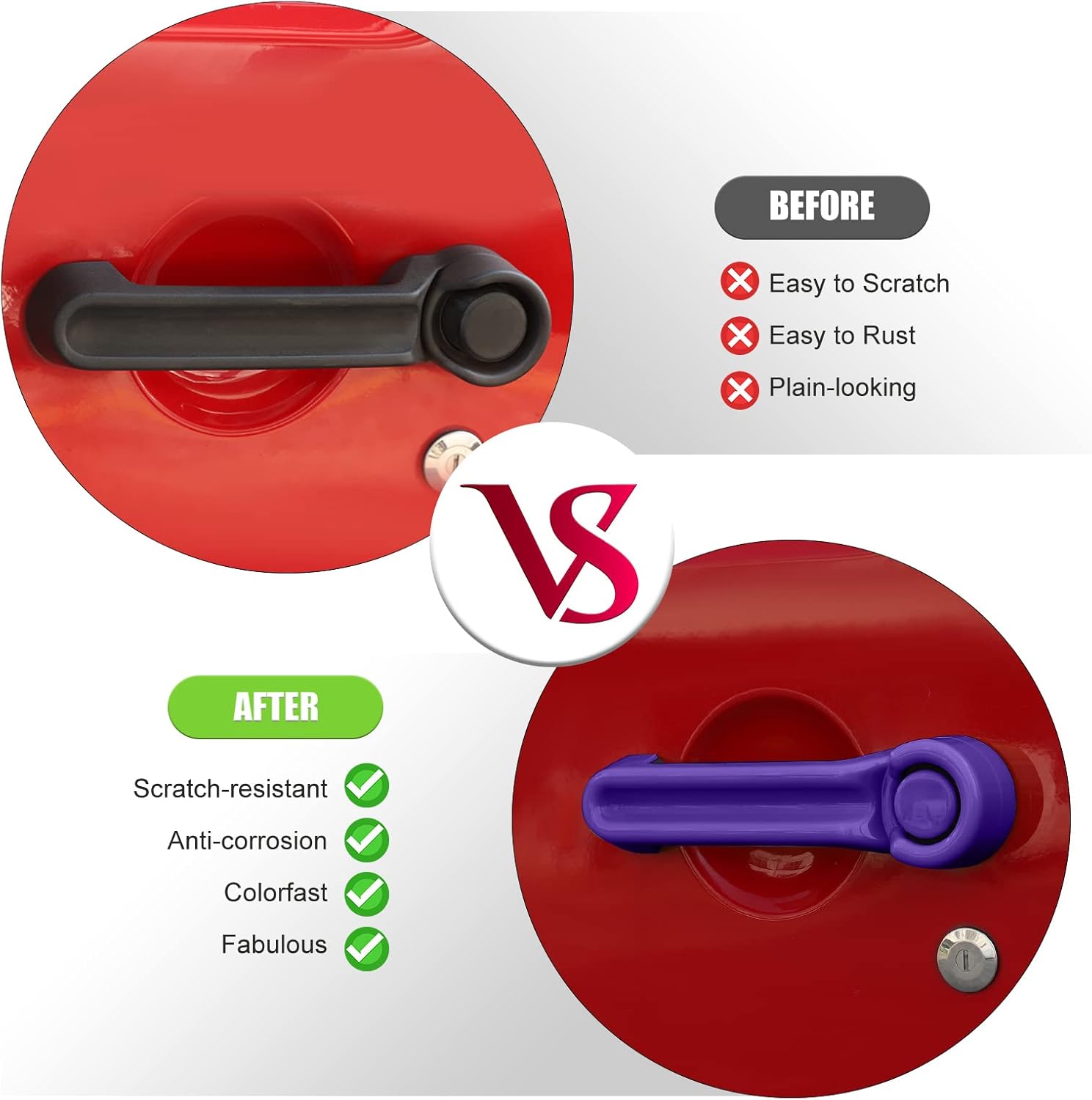 🌈CheroCar Door Handle Cover Kit & Tailgate Handle Cover Accessorie🌈Our CheroCar Company IdeasAlways adhere to the customer first, quality first, service first.Production Control- All products are produced after repeated proofing, test and small batch production, in order to let the products received by all customers are the most perfect and most suitable.- CheroCar all products have the QC in each process for inspection, the quality can be guaranteed accordingly.Installation Notes- Door Handle Cover Kit & Tailgate Handle Cover to install with double-sided tape.- Use a hair dryer to heat the double-sided tape.- With double-sided tape adhesives tape on the back, Cleaning surface and heat the double-sided tape by a hair dryer before stick on, then press it almost 1 minute- It is best to place the some items after 12H, the cover will be kept more sticky.About Our Engine Door Handle Cover Kit & Tailgate Handle Cover Accessories- Our product perfect fits for 2007-2018 Jeep Wrangler JK- Made of durable and long lasting material.Durable and color will not fade out- Decorate your car charming luxury vivid, help DIY a style and atitute for your Jeep Wrangler JK- Well constructed, made up of a solid piece of plastic with just the right amount of flexibility to it- Easy to install, - Cover existing scratches and prevents your car from future finger nails, keys scratches etc.Worry-Free to buy- We believe in our products. That's why we back them all with an 12-month warranty and provide friendly, easy-to-reach support.- If you have any suggestions for improvement of our products, please be sure to email us at the first time, we will make corresponding improvements in time.What's in the Box5pcs/set CheroCar Door Handle Cover Kit & Tailgate Handle Cover s ReplacementThank you.