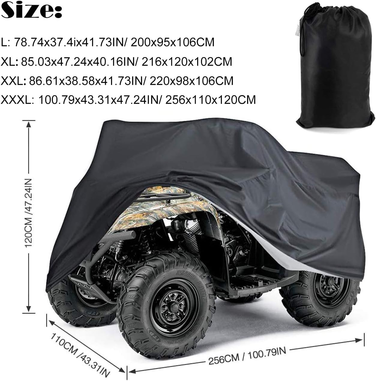 Specification:Condition: NewColor: BlackMaterial: 210D OxfordWarm Tips: Pls check your ATV size before your purchase to avoid your time and cost.Size Chart:L: 78.74x37.4ix41.73IN/ 200x95x106CMXL: 85.03x47.24x40.16IN/ 216x120x102CMXXL: 86.61x38.58x41.73IN/ 220x98x106CMXXXL: 100.79x43.31x47.24IN/ 256x110x120CMFeatures:Light Weight Fabric to Protect your ATVElastic band at the bottom of coverProtect your ATV form water/ wind/ dust/ tear/ snowFit for most atv, 4 wheeler, quad, this covers Replacement for Polaris Kawasaki Suzuki and so onPackage Includes:1 Pcs ATV Cover1 Pcs Storage Bag