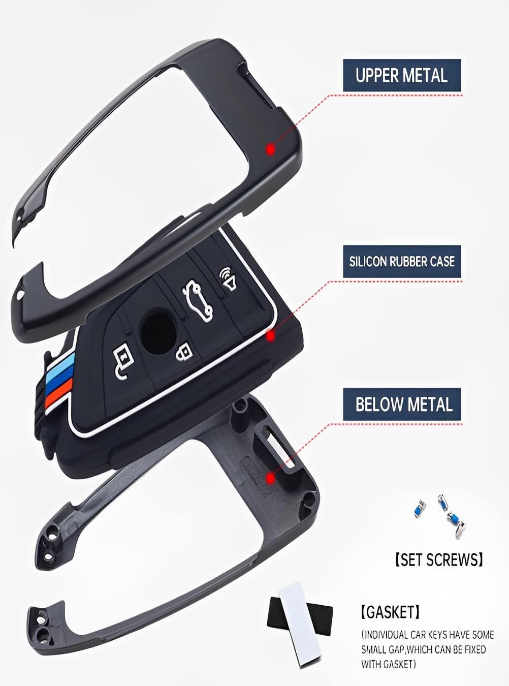 Product Description Compatible with for bmw,(Please refer to the appearance of the 2nd picture)(3,4 buttons) Fit For BMW 2 Series Fit For BMW 5 Series 2018 New Fit For BMW 6 Series GT Fit For BMW 7 Series 2016-up Fit For BMW X1 2016-up Fit For BMW X2 2018 New Fit For BMW X3 2018 New Fit For BMW X5 2014-up Fit For BMW X6 2014-up Fit For BMW M5 2018-2021 Fit For BMW GT3 Series 2014-2021 Fit For BMW GT5 Series 2014-2020 Notice: Even if the car model is the same, the car key might be different based on the different years of manufacturing, so please check carefully if your key fob is the same shape as the picture2 shown before purchasing this car key case. car key case Made of zinc alloy + silicone, no induced signal interference.Effectively protect the key from failing and scratch. night fluorescence effect fluorescent button,flucrescent three-color bar Easy to Install: Only put the car key into the key case according to the corresponding button, and then tighten it with the screws we provide, takes very little time finished it Package Include: 1 * Key Fob Case 1 * Keychain 1 * Screwdriver (Not included Key Fob)