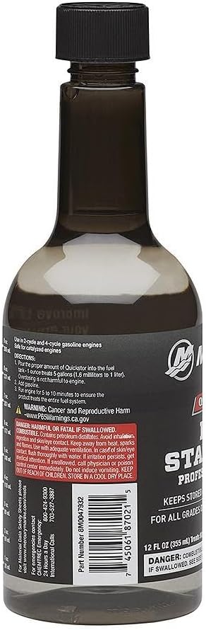 At the end of the season, store your marine, lawn and powersports equipment with confidence with Mercury Quickstor Fuel Stabilizer 8M0047932. It's professionally formulated to prevent regular and ethanol-blended fuel from breaking down for up to two years in any 2‑stroke or 4-stroke carbureted or fuel‑injected gasoline engine. In addition to defending against fuel-related problems, Quickstor also lubricates injectors and carburetors, while preventing fuel system corrosion. Use it for long-term storage of cars, trucks, motorcycles, ATVs, snowmobiles, marine engines, lawn mowers, chainsaws, string trimmers and snow blowers. Safe for catalyzed engines. 1 ounce treats 5 gallons of fuel.