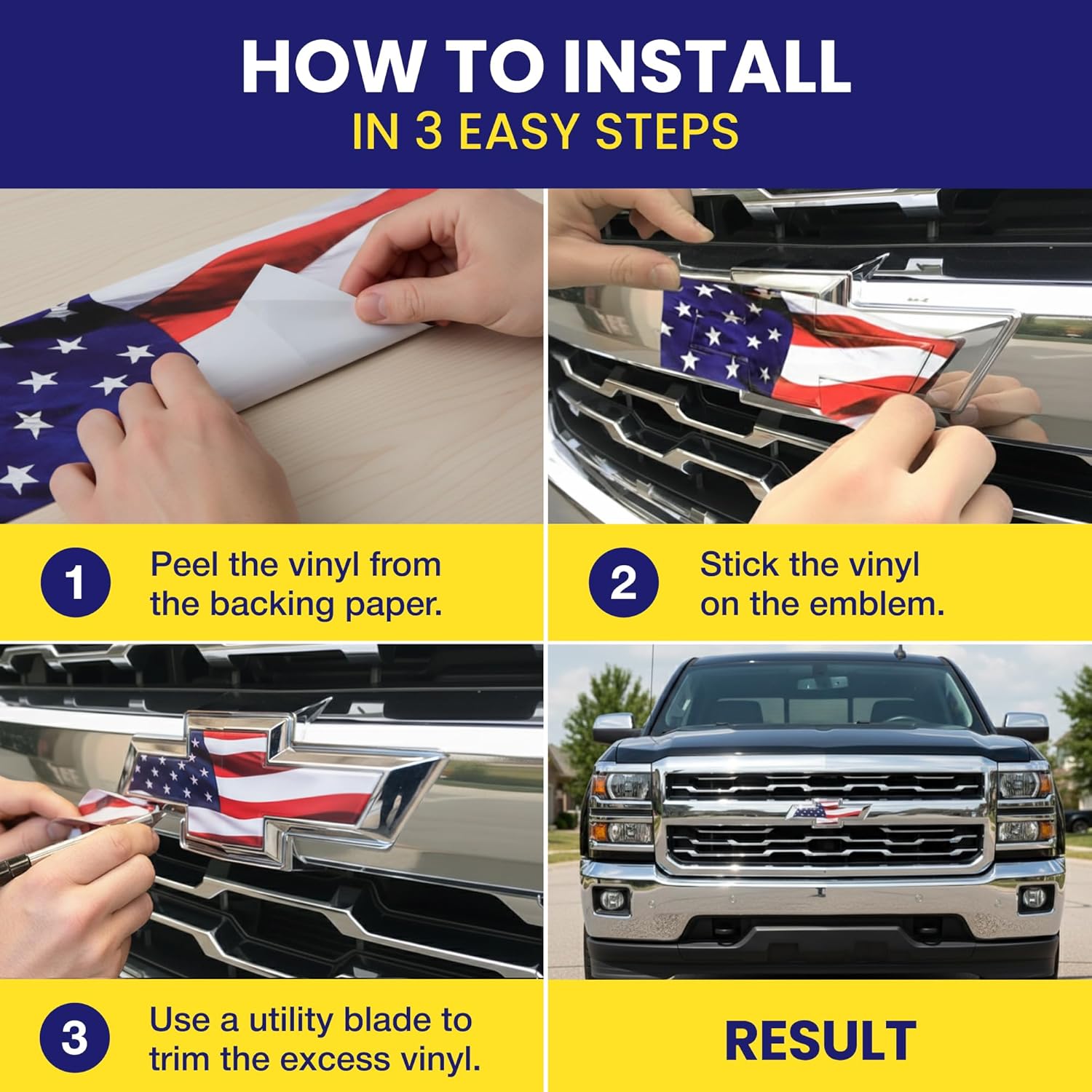 2 Glossy Custom Printed American Flag Premium Vinyl Sheets. These fit on the front grille bowtie emblem and the rear tailgate bowtie emblem. You cut these out yourself (DIY). Vinyl is performance rated for 6 years. Printed on Premium High Tac vinyl so these will stick on your emblems and not fall off like normal vinyl would. Each flag sheet measures 10 1/4 inches wide by 3 1/2 inches top to bottom. These are compatible with Silverado 1500 Truck Model Years 2014-2018. Easy to install, just peel away backing paper and stick flag sheet on top of bowtie emblem then cut around Gold Bowtie edges with a sharp razor blade or knife. Extras - You will also receive a 3rd sheet of vinyl which is ideal for DIY'ers to practice with before installing your final product. Installation instructions are included.