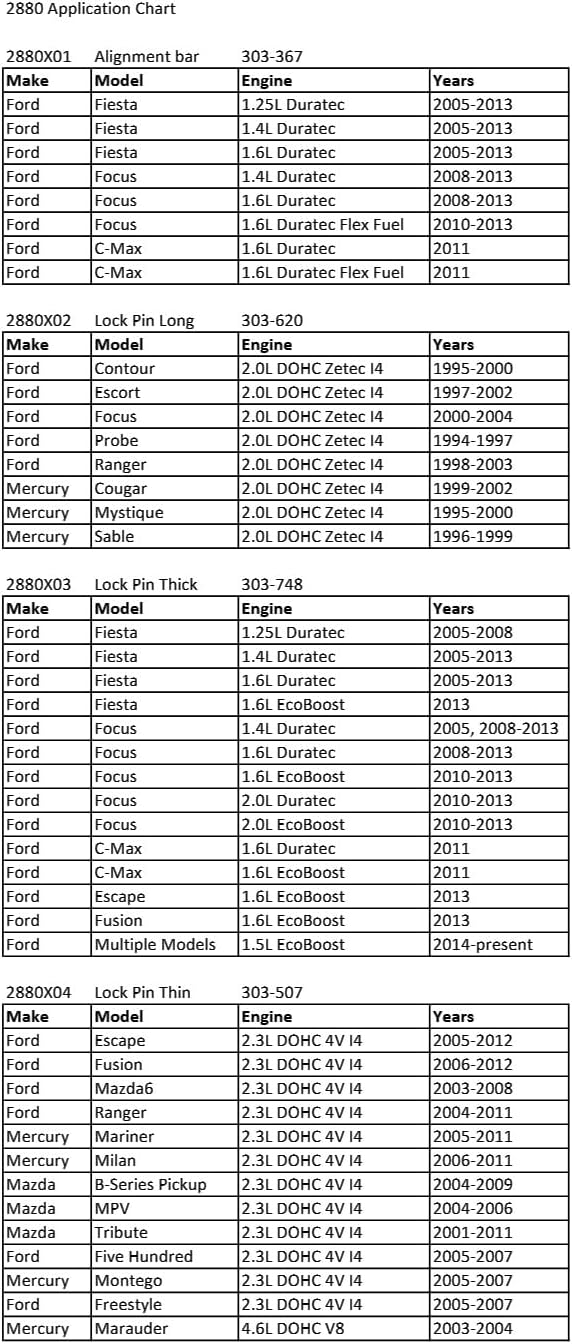 CTA Tools 2880 Camshaft Timing Kit - Ford and Mazda is designed for locking and positioning camshafts, crankshafts and injection pump sprockets when replacing timing belts or chains. The kit includes a setting gauge and 3 different locking pins. For servicing '04 - '09 Mazda 3, '06 - '10 Mazda 5, '05 - '08 Ford Escape, '03 - '07 Ford Focus and '06 - '09 Ford Fusion, including all HWDA, HWDB, & HXDA engines. Heavy-duty construction allows for strength and durability. Whether tuning up your '68 Corvette or changing the oil on a John Deere tractor, CTA can supply you with the tools needed to do the job. California Prop 65 - Warning, This product contains chemicals known to the State of California to cause cancer, birth defects or other reproductive harm.