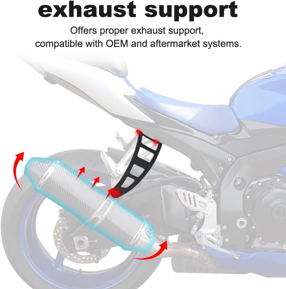 Motorcycle Exhaust Hanger Xitomer Exhaust Hanger is made with extremely stable tube-in-tube construction and follow the lines of the bike perfectly, giving it a customized appearance. Function: Made of high-quality aluminum, it is lightweight but sturdy, providing strong exhaust system support when reducing stress on your motorcycle. Advantages: - Adopting high-quality materials and advanced processing techniques to extend service life - Black powder coating, sleek lines, and a sleek design enhance the motorcycle's racing allure. Fitment: Aftermarket Fit For GSX-R750 2011-2024 Aftermarket Fit For GSX-R600 2011-2018 Easy to install, without instructions Specifications: Condition: brand new (Aftermarket product, No OEM one) Material: high quality aluminum(Durable Black Powder Coating) Package include: 1 Set of Hanger with Bolts