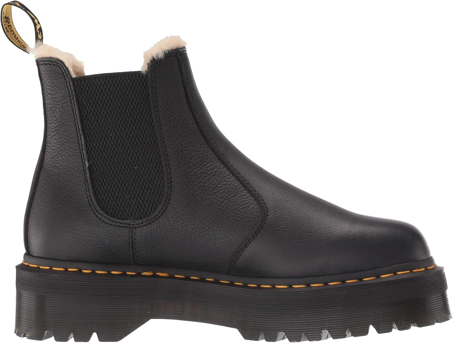 The iconic Chelsea silhouette and warm interior lining of the Dr. Martens® 2976 Platform Faux-Fur Lined boots will have you set for the season. Pisa leather upper is a medium-weight milled nappa leather with a super-soft tumbled handle and richly pigmented waxy finish.Features classic Doc's DNA including visible yellow stitching, signature heel loop, and grooved outsole. Side elastic gussets for easy on and off and a comfortable fit.Soft faux-fur lining for a warm and comfortable interior fit. Cushioned textile footbed with faux-fur lining for added warmth and underfoot support.Goodyear® welted construction offers exceptional flexibility. Air-cushioned outsole is oil and fat resistant and has superb abrasion and slip resistance.Higher platform sole has a rugged commando tread for excellent traction.Imported.Measurements: Heel Height: 1 3⁄4 in Weight: 2 lbs 3 oz Circumference: 10 1⁄2 in Shaft: 6 1⁄2 in Platform Height: 1 1⁄4 inProduct measurements were taken using size UK 10 (US Men's 11), width Medium. Please note that measurements may vary by size.Weight of footwear is based on a single item, not a pair.