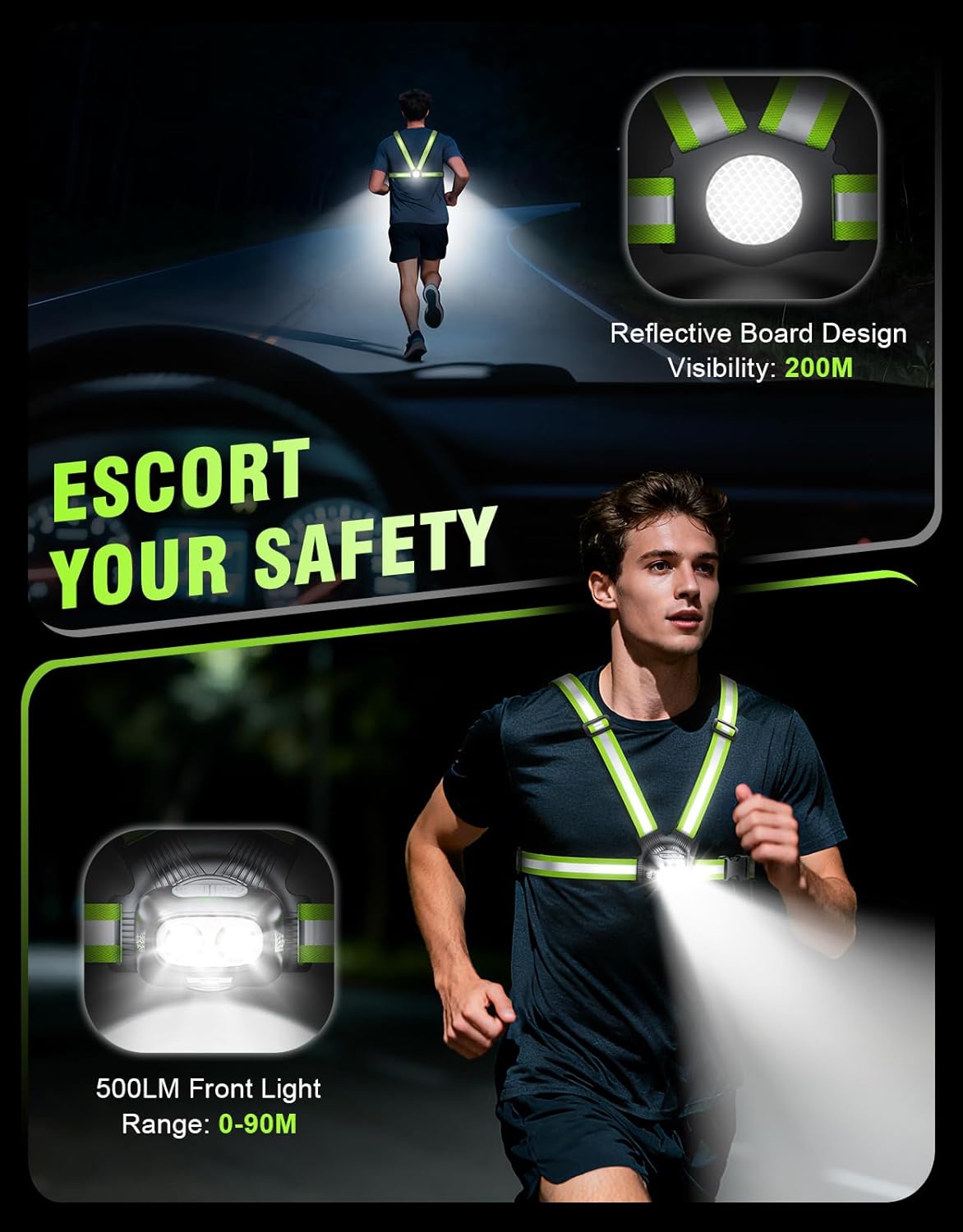 | Additional Features | ①500LM Ultra Bright Chest Light, ②1800mAh Rechargeable Battery, ③7 Modes & 45° Adjustable Beam, ④Adjustable Double Reflective Vest Straps, ⑤IPX4 Waterproof |
