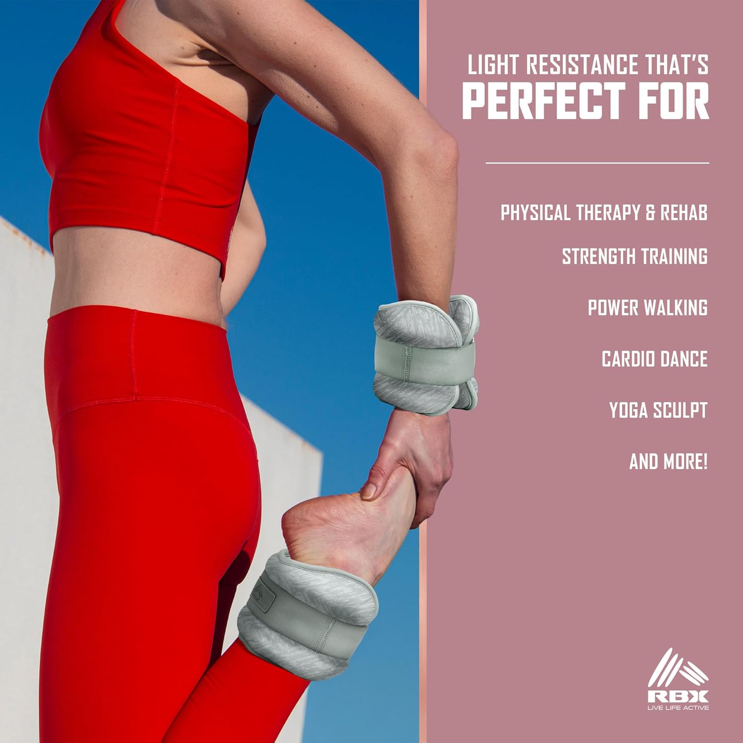 Elevate every workout with the RBX Wrist & Ankle Weights Set — designed to help add extra resistance, balance, and power to your training. Wear them on your wrists to help sculpt and define your arms or on your ankles to assist with strengthening and toning your legs. Each weight features soft-touch, breathable material that keeps you comfortable and dry as you move. The adjustable hook-and-loop closure ensures a secure fit on most wrists and ankles, so you can focus on form and performance without distraction. Lightweight yet effective, these 2LB weights are perfect for a variety of workouts — from yoga, Pilates, and walking to strength circuits and mobility training. They help engage your muscles, increase endurance, and bring a little extra intensity to your favorite exercises. Designed for every fitness level, RBX Wrist & Ankle Weights help you challenge yourself and feel stronger with every rep. Wherever you train, step up your workouts and experience the difference with each move.