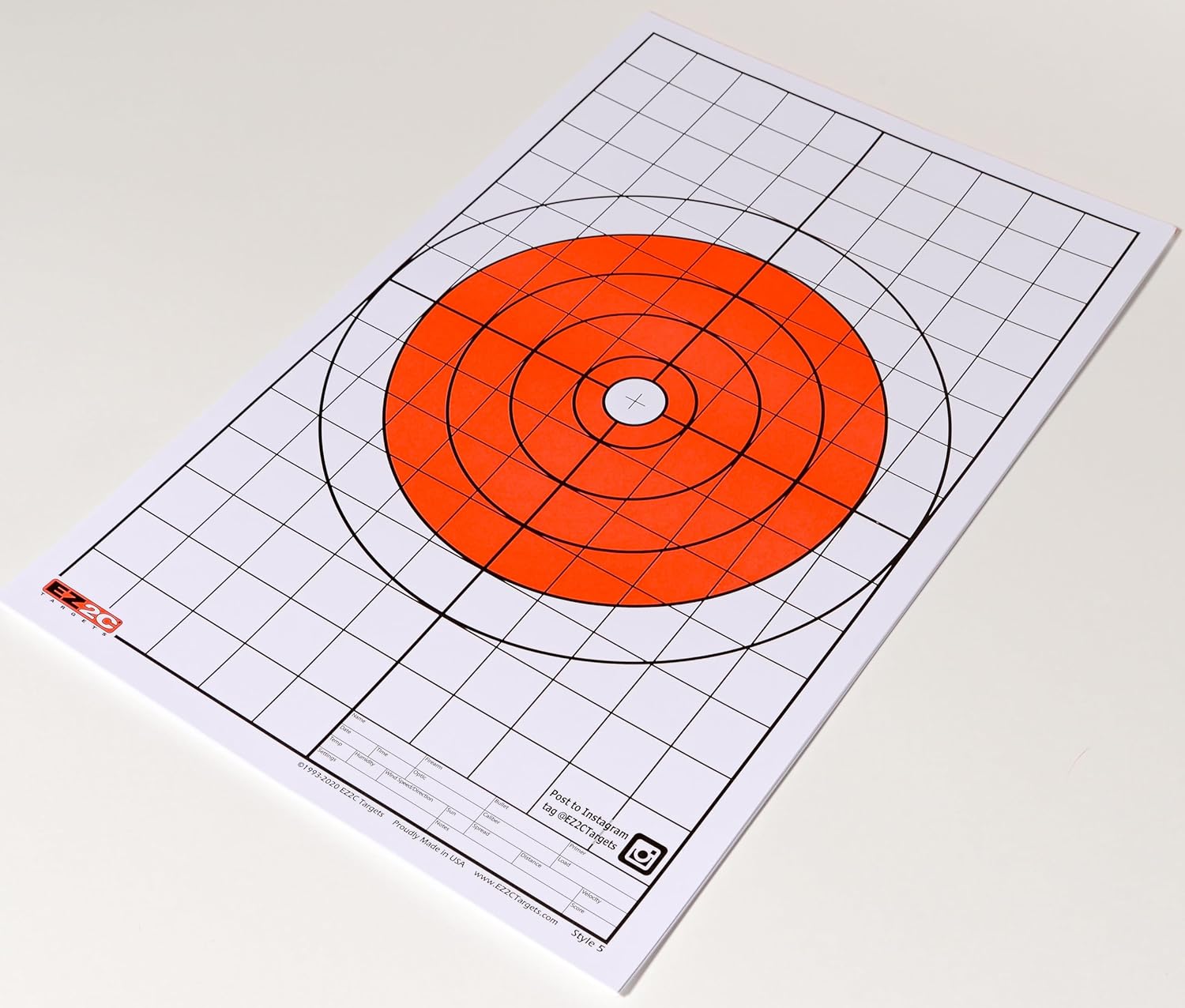 This is our best combination target for both rifle and/or pistol. One 10"-8"-6"-4"-2"-1" bulls-eye is centered on a 10" x 16" grid. Both horizontal and vertical center lines are thickened for sighting in. Targets are on 11" x 17" High-Quality Bright White Paper. They are Conveniently Packaged with 25 Paper Targets per Pad.
