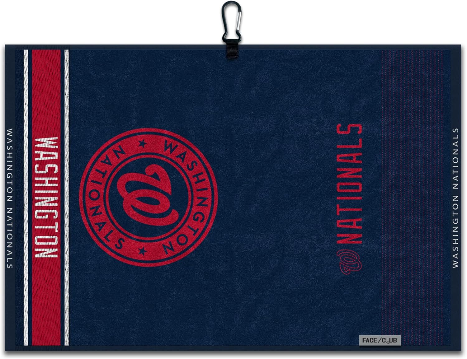 Ingenuity meets versatility with the patented dual-textured 16" x 24" Face/Club Jacquard towel. Innovative woven ribs capture dirt from your clubs and a woven label denotes division between the cleaning surfaces. This sheared towel is both absorbent and soft to the touch. The bold colors and five woven team trademarks make a great way to show off your team spirit on the course. Yarn died 100% cotton with centrally placed carabiner for easy access and to keep towel off the ground.