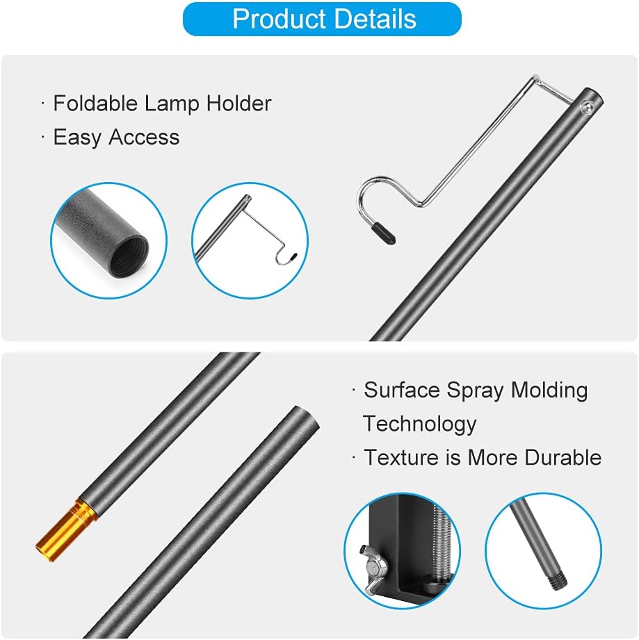 Our camping light frame is made of high-quality ultra-light aluminum alloy, which is light in weight and durable. Multi-segment splicing design, detachable design allows you to freely combine the height of the light stand. You can clip it to the edge of the table or insert it into the ground. Easy to carry, suitable for various outdoor activities and indoor hanging lightweight items. More Features: 1. The portable light stand is small in size, foldable design, light and easy to carry. 2. The light pole is made of aluminum alloy, which is durable, effectively windproof, and has strong support.(Maximum bearing weight 5kg/176.4oz) 3. Highly free combination. It can be clipped on the table or plugged into the ground. 4. The lamp holder can also be used as a bottle opener, which is convenient for you to drink at any time. 5. You can use it for hiking, camping, rock climbing or just for light objects in the bedroom. Specification: 1. Material: Aluminum Alloy 2. Colour: Black 3.Size: 47.24 in/120 cm 4.Weight: 11.09 oz / 314 g Package Included: 3× Section Poles 1 × Storage Bag 1× Stake 1 × Light Hooks 1× Screw Clamp