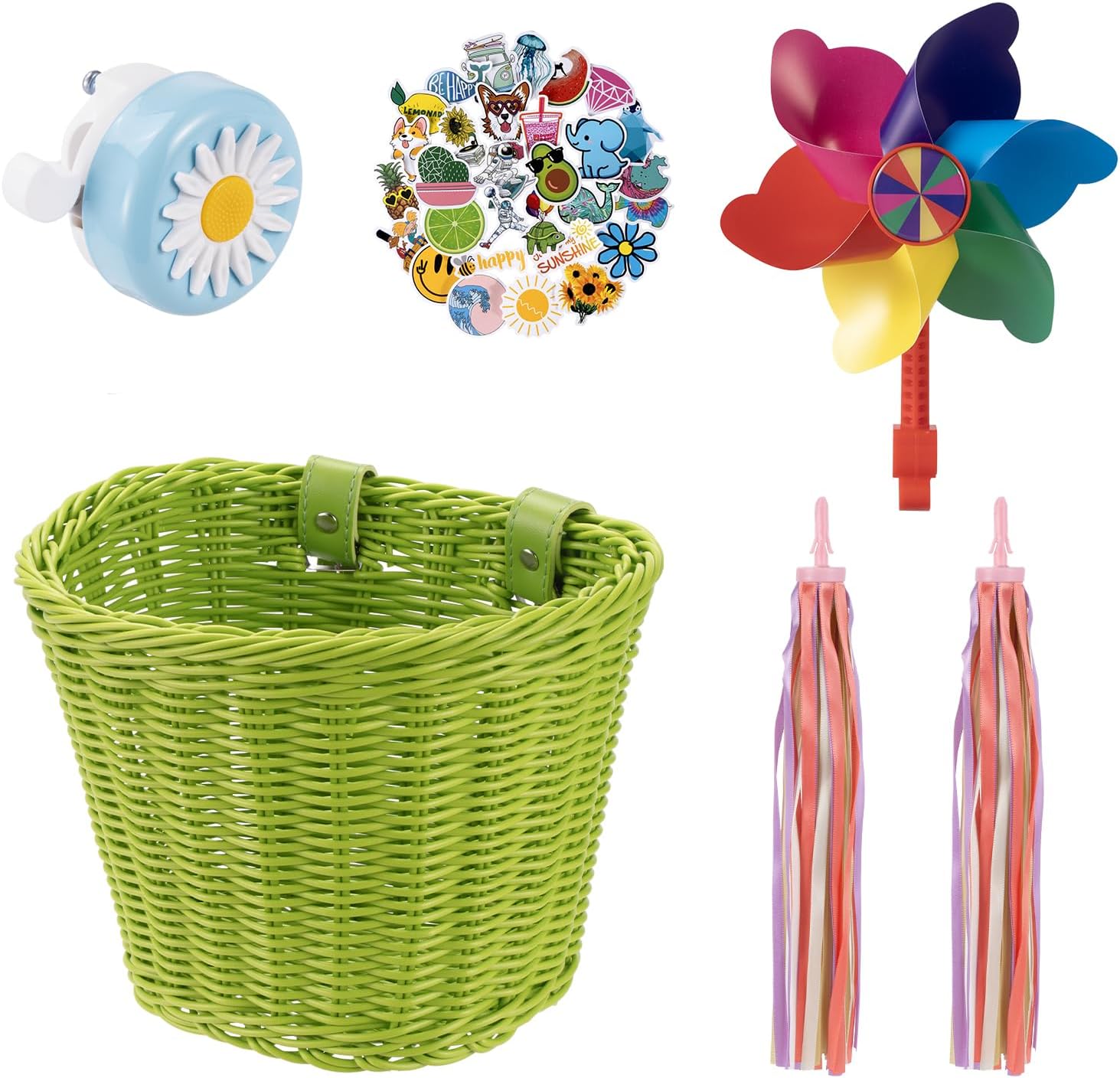 Kids Bike Basket, Bike Basket Front Bike Accessories for Girl Boys, Woven Bicycle Basket with Stickers, Bike Bell, Windmill, and 1pairs Colorful Ribbons Tassels