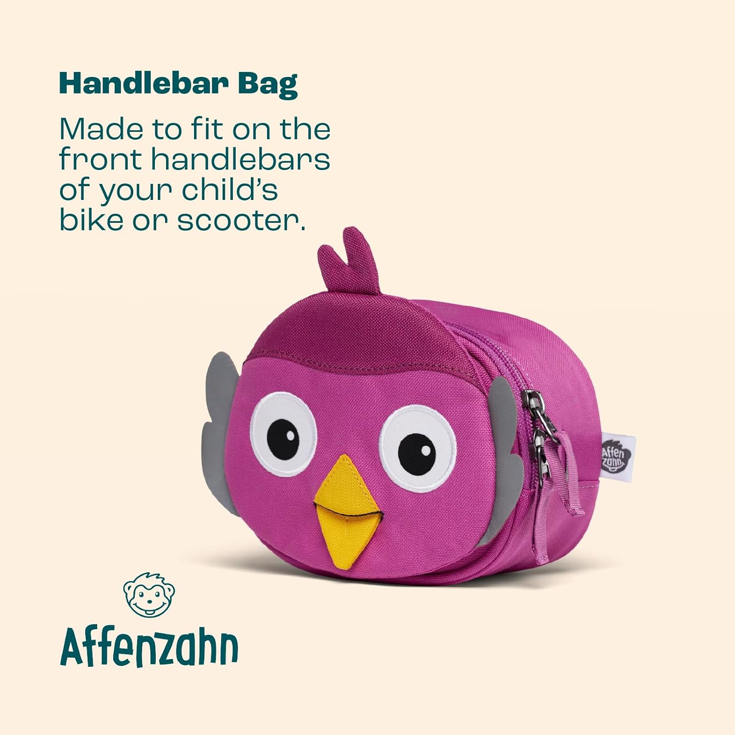 Affenzahn’s Bird Handlebar Bag for toddlers and kids is made to fit on the front handlebars of their bike or scooter. Ideal for boys and girls, our animal handlebar bags are a new best friend for your little one. Complete the set with our Large/Small Friend Backpacks (sold separately) and get the matching animal to the Handlebar Bag. With a 1 L capacity (5.7 x 4.3 x 3 inches), this kids bike bag has enough space for all the little things you can’t go without on your trip. Made with an elastic strap and hook & loop fastener, this kids handlebar bag fits on any bike or scooter. The unique pull-out tongue with name tag can be filled in with contact information. Together with their favorite animal, your child can discover the world on their balance bike, bicycle or scooter, with everything they need at hand. This bike handlebar bag for kids is equipped with reflectors that reflect the light in the dark. Handcrafted embroidered, these handlebar bags are built to withstand your child’s adventures. Easy to clean and water-repellant with PFC-free impregnation, our Bird Handlebar Bag is made from 100% polyester, of which 48% is made of recycled polyester and 1 PET bottle. Designed in Europe, with a lot of love for detail, our Handlebar Bag provides a practical bag to use.