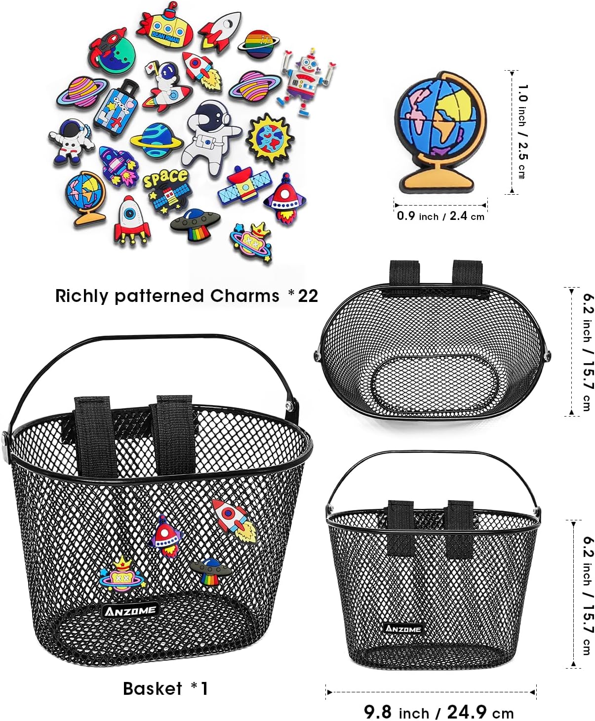ANZOME Kids Bike Basket – Rust-Proof Metal Wire Bicycle Basket with Quick-Release Straps & Carry Handle, Fits Most 12-20" Kids’ Bikes & Tricycles, Black Key Product Features (Amazon-style Bullet Points) Heavy-Duty Wire Construction – Forged from thick, high-tensile steel mesh that resists dents and deformation; finished with a weather-proof, anti-rust coating for year-round durability. 60-Second Tool-Free Mounting – Extra-wide, adjustable hook-and-loop straps wrap securely around almost any handlebar; detach just as fast to convert the basket into a shoulder-carry tote (shoulder strap included). Kid-Sized, Retro Design – Compact 9.4" L × 7.5" W × 6.7" H (approx.)—perfect for snacks, toys, water bottles, or school supplies without weighing young riders down; classic oval silhouette gives any bike a stylish vintage vibe. Universal Fit for 12–20" Bikes & Trikes – Flexible strap system adapts to most children’s bicycles, balance bikes, and tricycles—no worrying about specific frame or bar diameters. Built-In Carry Handle & Safety Tip – Sturdy top handle lets kids take their treasures on the go; for items hotter than 80 °F (27 °C), add a liner first to protect the basket’s waterproof coating. Product Description Turn every ride into an adventure with the ANZOME Kids Bike Basket. Engineered from premium steel mesh and protected by a rust-resistant powder coat, this lightweight yet tough basket can handle daily bumps, splashes, and muddy shortcuts. The quick-release hook-and-loop straps mean installation (or removal) takes less than a minute—no tools, no frustration. Sized just right for young explorers, the basket holds everything from lunchboxes and plush toys to seashells collected at the park. A built-in carry handle and bonus shoulder strap let children pop the basket off the bike and use it as a handy shopping or picnic tote. Whether you’re outfitting a 12-inch starter bike or a 20-inch neighborhood cruiser, the flexible strap mount ensures a wobble-free fit. Give your child the freedom to carry their own gear—and give yourself one less thing to juggle—with ANZOME.