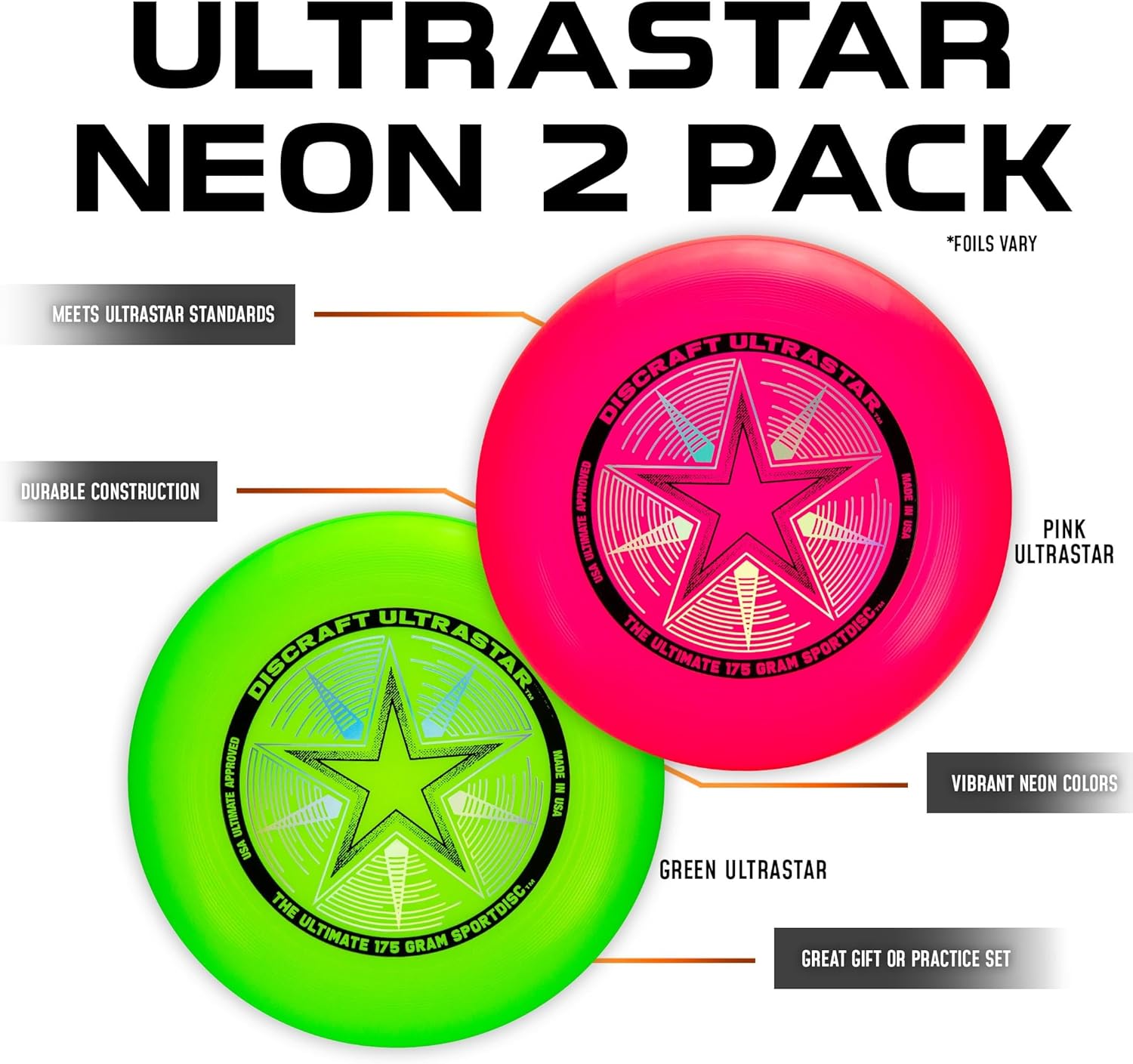 The world standard for the sport of Ultimate, and the official disc of the USA Ultimate Championship Series. With its contoured grip and aerodynamic engineering, the Ultra-Star has set the standard for quality, consistency and performance.