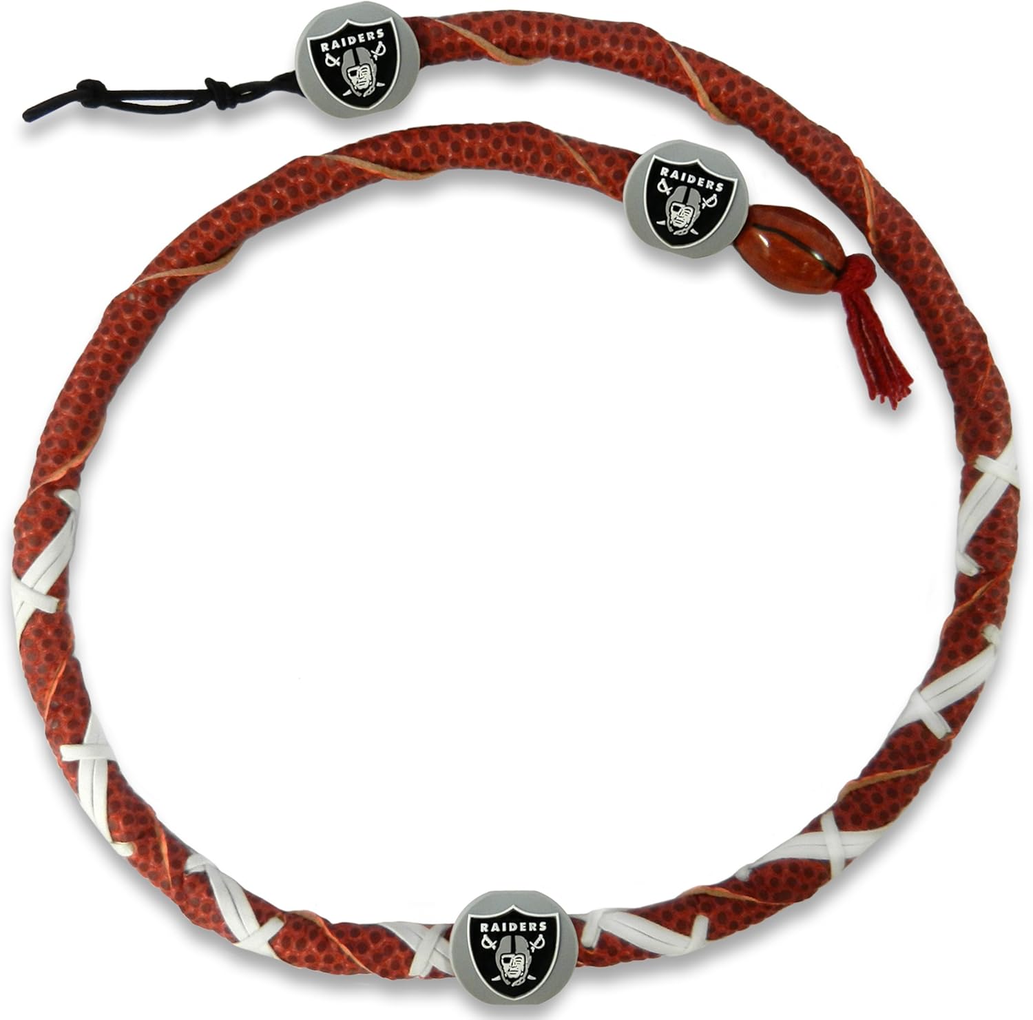 Show off your favorite National Football League team by wearing this officially licensed NFL Spiral Football Necklace from GameWear. Each necklace is made from genuine football leather to create the look of a tight spiral thrown by your favorite NFL quarterback. Necklaces feature three colorful beads, adorned with your favorite team's logo and colors. Necklaces are one-size-fits-all and have a unique elastic football bead closure for a loose and comfy fit.
