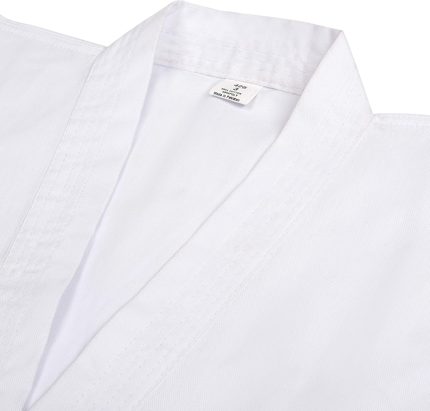 Please follow the size chart to find your right size. If you fall in between 2 sizes or on the border of a size consider buying 1 size up or feel free to ask a question if you still can't decide. We ensure great quality with customer satisfaction as our top priority. Our medium weight karate uniform is made of high-quality breathable polyester cotton which will prevent excessive perspiration and keeps body comfortable while eliminating sweating, everything you hope for. Fiber content is 55% cotton and 45% polyester. Fabric weight is 7 oz per square yard or 7.5oz per meter, (3% tolerance level) Suit is mainly designed for karate but may also be using for practice various youth or adult Martial Arts systems such as Taekwondo, Judo, BJJ Cross over style jacket is also used in some Taekwondo classes (please consult your instructor). The uniform suit makes the practitioner feeling comfortable during trainings, meeting the requirements of traditional Karate practice. An ideal set for entry level students. Karate clothing is sweat-absorbent and comfortable to wear and it is the best choice for many karate enthusiasts. A Plain Ghi uniform without logo, allowing school owners to install their own customize emblem or logo. Medium weight and resistant will offer the best performance during combat, competition sports and intense training. We ensured exquisite workmanship, delicate sewing, very minimum shrinkage, no deformation and moisture absorption. It allows you maximum kick motions and full flexible play. Trouser waist designed with wide elastic belt plus functional drawstring to fit comfortably on all body types. Karate Uniform Package Includes: 1 x Jacket, Pant and Belt