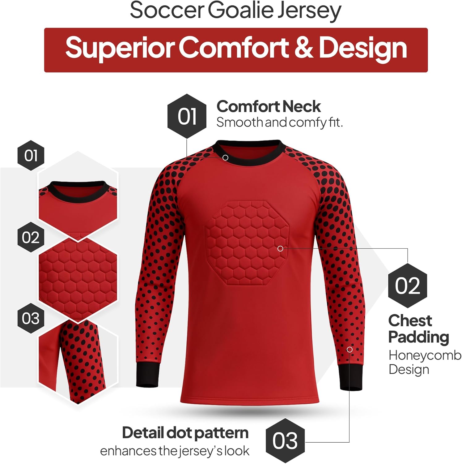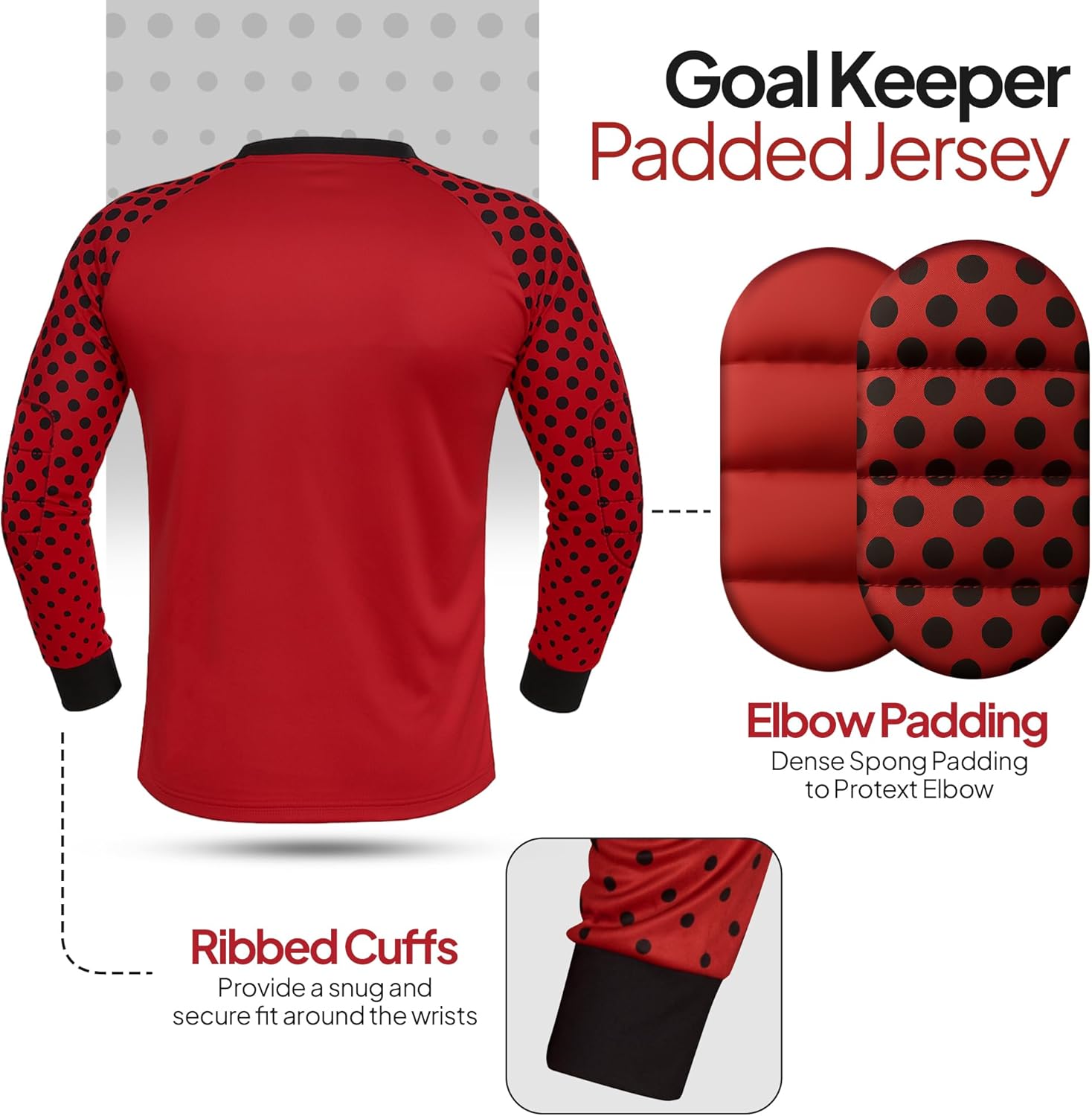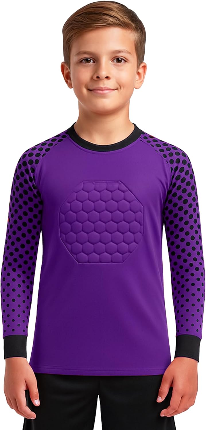 Give your young goalkeeper the confidence to save every shot! INTENZ Kids Goalkeeper Jersey is specially designed for youth players ages 5 to 14 years, offering strong protection, comfort, and a stylish design. The jersey features honeycomb chest padding and dense elbow pads to protect kids during dives and falls. Made from breathable, quick-dry fabric, it keeps little players cool and comfortable during practices and matches. The ribbed cuffs and comfort neck ensure a secure fit that doesn’t slip while playing. The modern dot-pattern sleeves give it a standout look that kids love. Perfect for training, school matches, football clubs, beginner goalkeepers, and team uniforms.