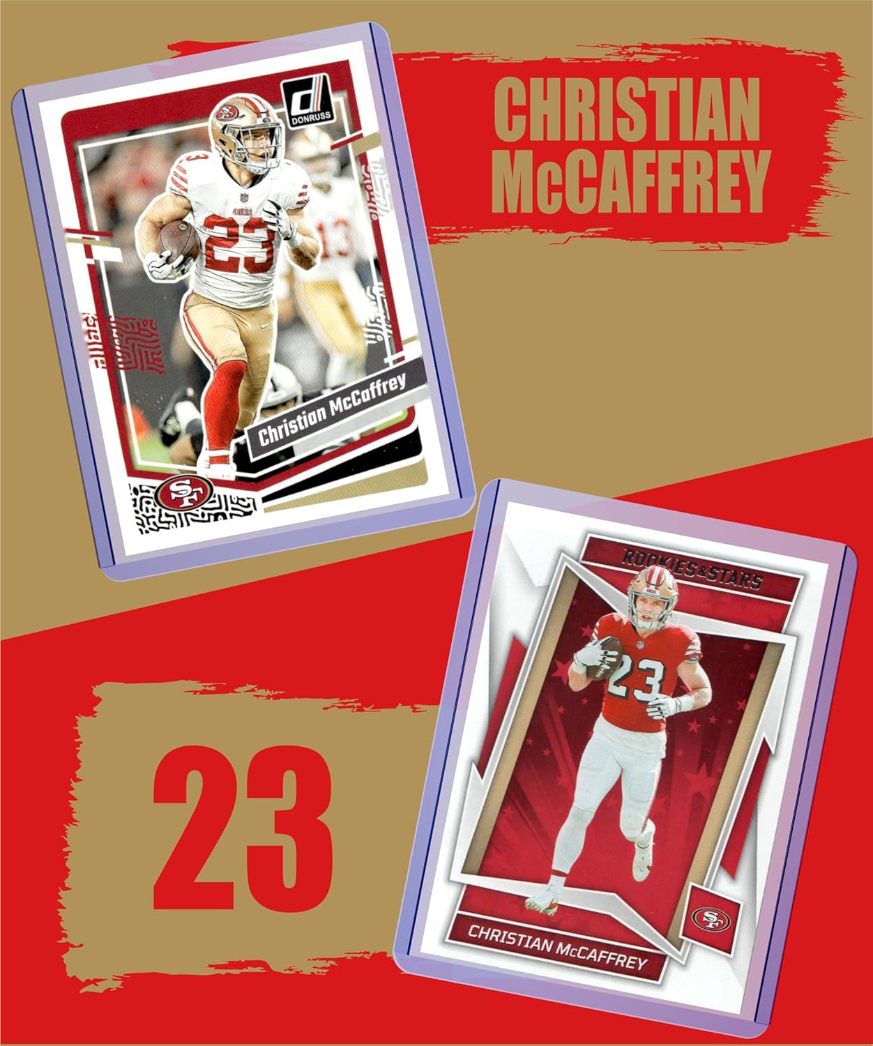 Grab this great lot of one of the top football players, Christian McCaffrey! Guaranteed to contain 5 authentic, licensed football trading cards of Christian McCaffrey. Exact assortment varies and could contain San Francisco 49ers uniforms. Each card comes in a protective sleeve and toploader case. The group comes in a gift bag with assorted color bracelets. Great for gift giving for collector's young and old.