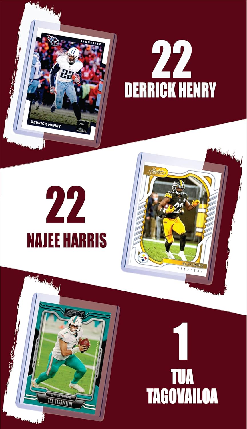 Grab this great lot of one of football's top players Alabama Football Legends: A.J. McCarron, Tua Tagovailoa, John Parker Wilson, Najee Harris, Derrick Henry, Shaun Alexander, Devonta Smith, Amari Cooper, and D.J. Hall! Guaranteed to contain 9 authentic, licensed football trading cards of Alabama Football Legends: A.J. McCarron, Tua Tagovailoa, John Parker Wilson, Najee Harris, Derrick Henry, Shaun Alexander, Devonta Smith, Amari Cooper, and D.J. Hall. Exact assortment varies and could contain Cincinnati Bengals, Miami Dolphins, Atlanta Falcons, Pittsburgh Steelers, Tennessee Titans, Philadelphia Eagles, and New York Giants uniforms. Each card comes in a protective sleeve and toploader case. The group comes in a gift bag with assorted color bracelets. Great for gift giving for collector's young and old. Great set of Crimson Tide greats. Roll tide!