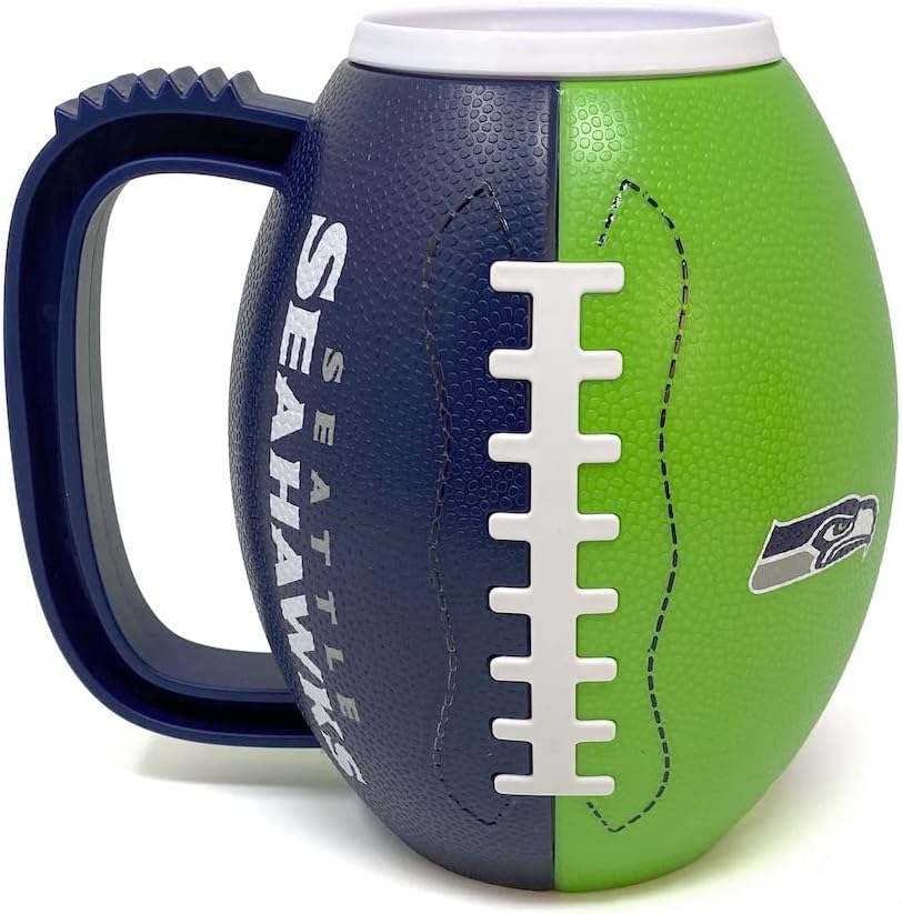 Get the ULTIMATE tailgating mug! Be the envy of all your friends and neighbors while you sip from this attractive 3D mug shaped like a football. Holds 23 oz. of your favorite beverage. Features team wordmark on one side and team logo with a textured football design.