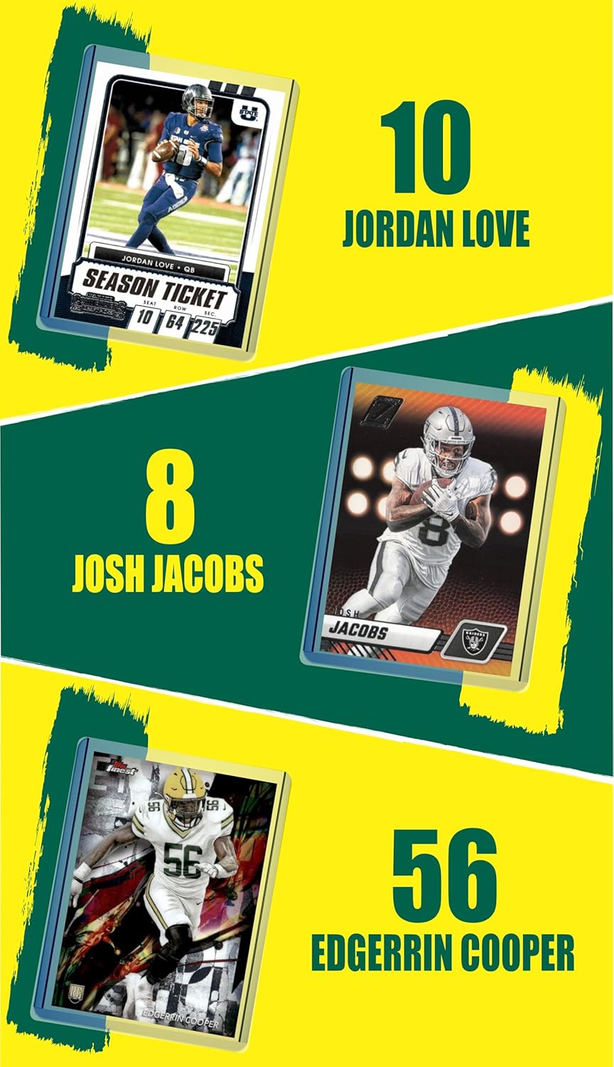 The Packers are red hot! This lot of ten 2006-2025 Green Bay Packers football cards makes a great gift and collectors item for any Packers fan. Guaranteed to include one card each of Jordan Love, Josh Jacobs, Jayden Reed, Ahman Green, Brett Favre, Aaron Rodgers, Micah Parsons, Christian Watson, Edgerrin Cooper, and Romeo Doubs. Exact card of each player varies and may include cards in past team uniforms. All cards are in near mint to mint condition and are shipped with each card in its own individual soft sleeve and top loader or semi-rigid sleeve. Comes with bonus gift bag and two wristbands in team colors, making it the perfect gift for the youth fan. WRISTBANDS AND GIFT BAG INCLUDED ARE UNBRANDED GIFT ITEMS AND DO NOT CONTAIN ANY TEAM OR LEAGUE RELATED BRANDING, LOGOS, OR TEXT.